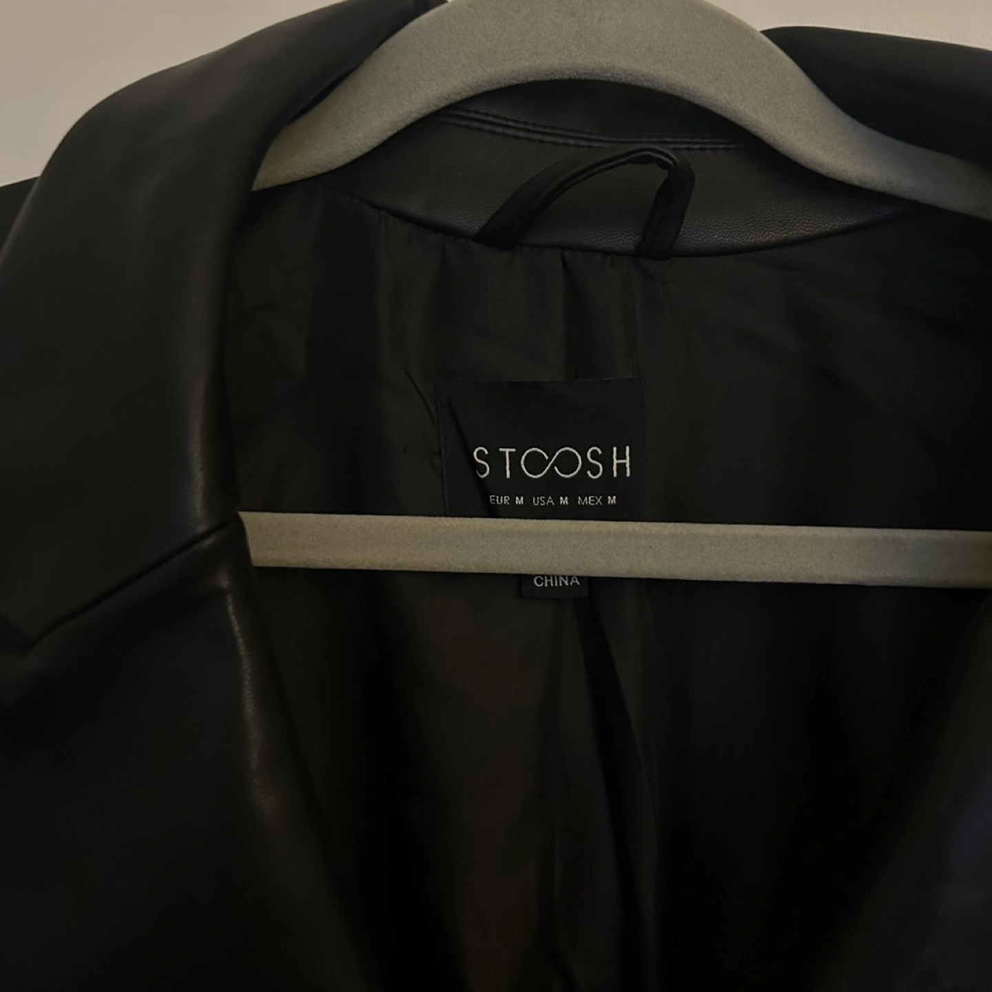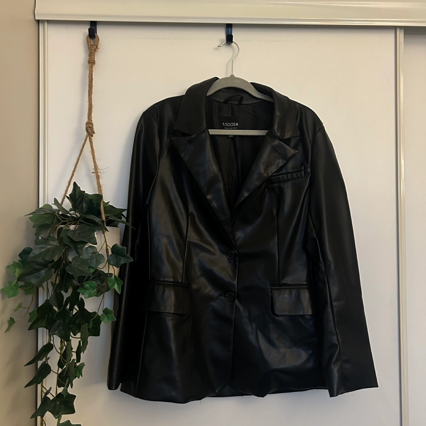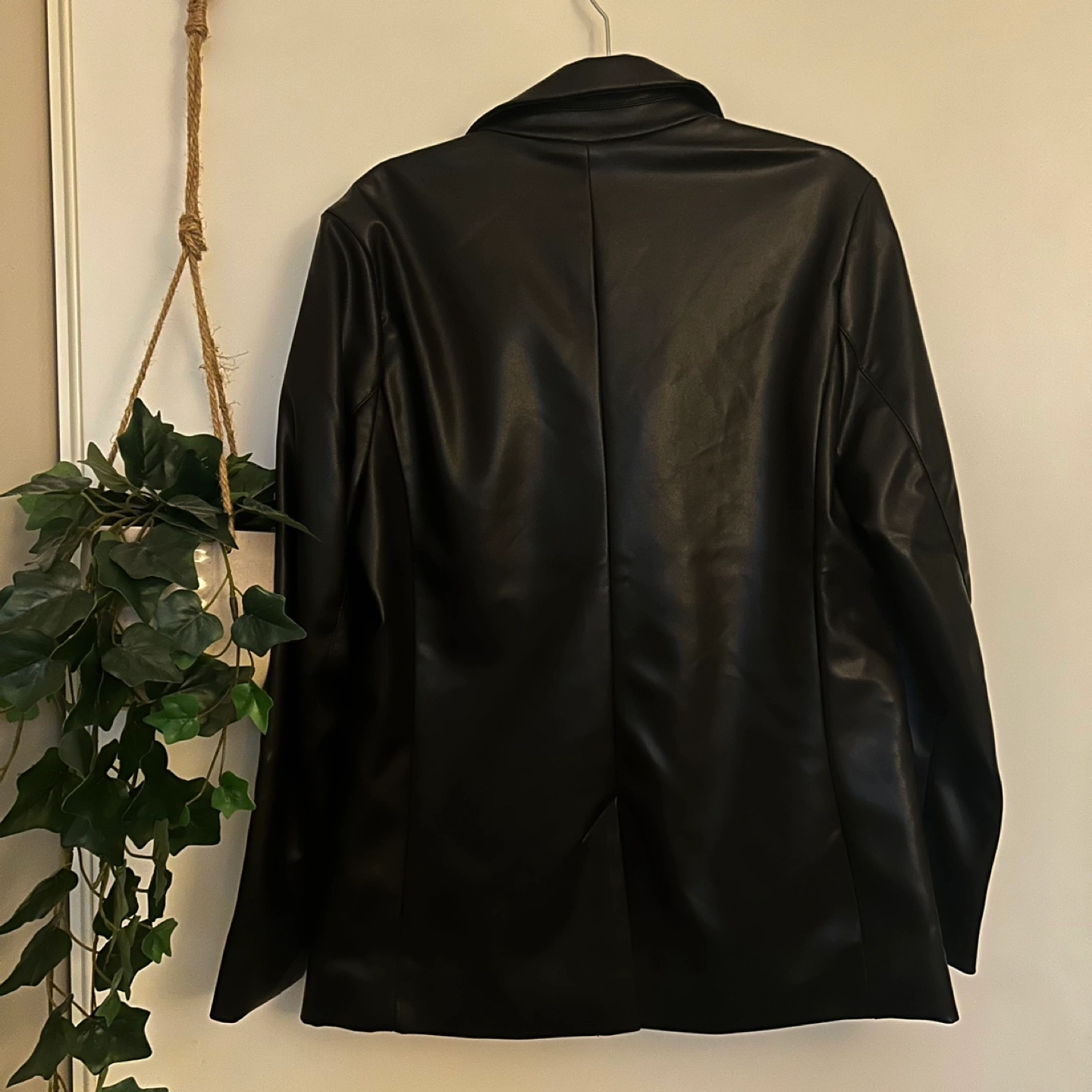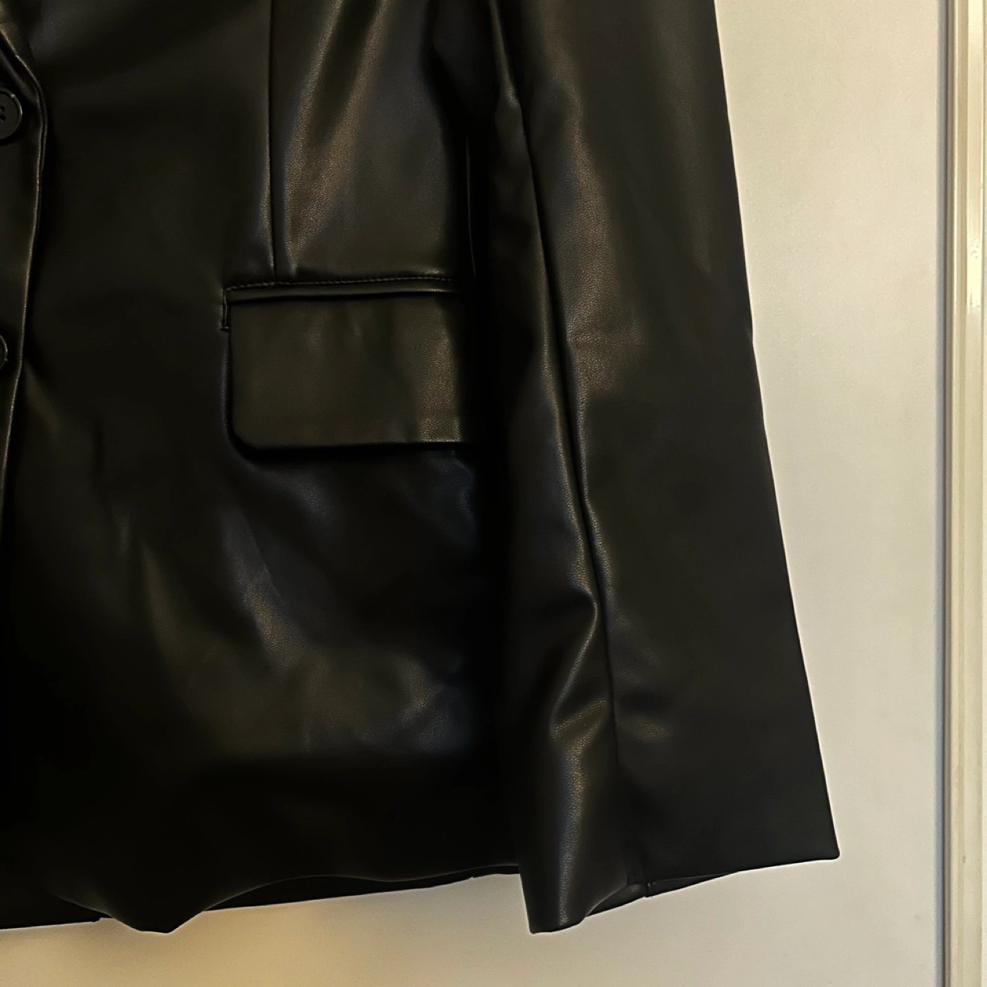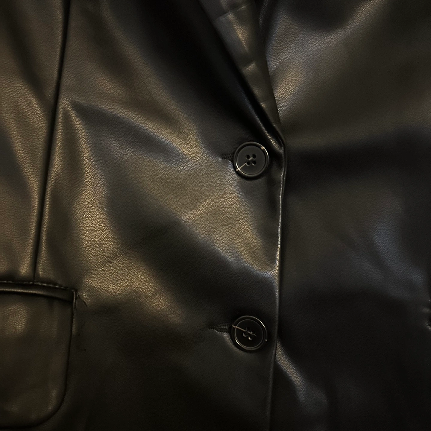 Black faux leather blazer with two buttons and pockets Size medium Purchased from Marshall's a couple years ago Selling as I have hardly worn it Pick up around Sherbourne & Wellesley
