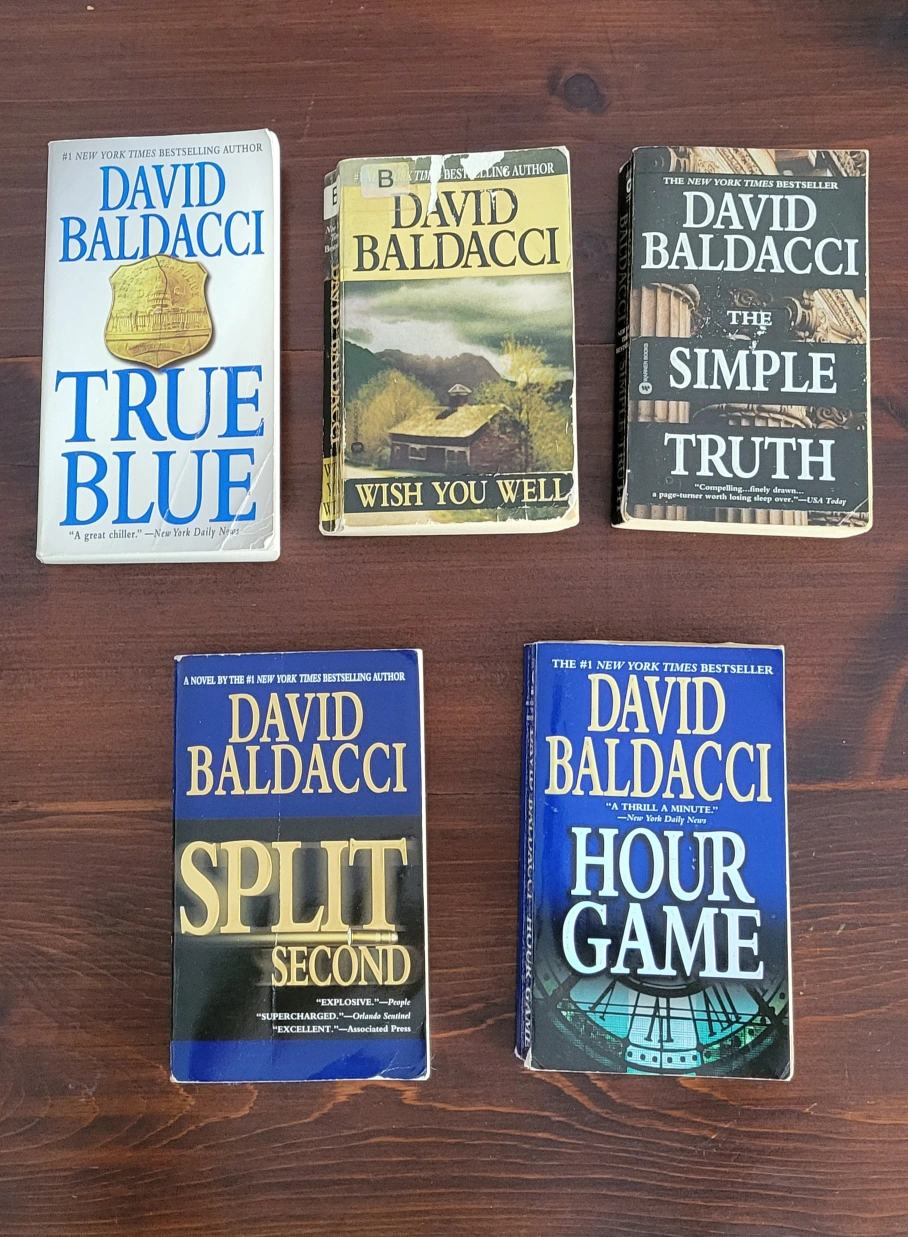 Five paperback novels by David Baldacci. Titles include: True Blue, Wish You Well, The Simple Truth, Split Second, and Hour Game. Pre-owned, showing some wear.