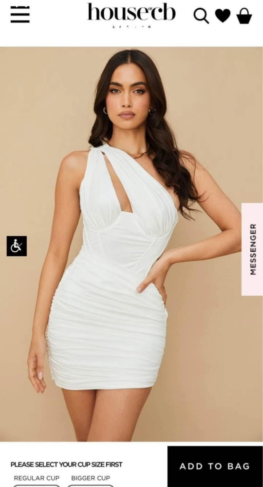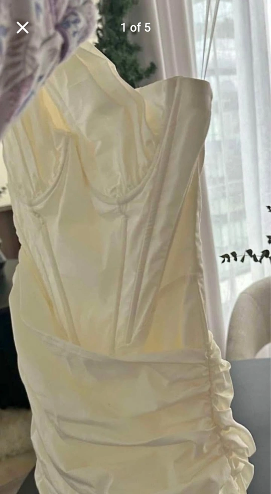 Stunning white mini dress. One-shoulder design. Ruched detailing. Corset bodice. Perfect for a night out.