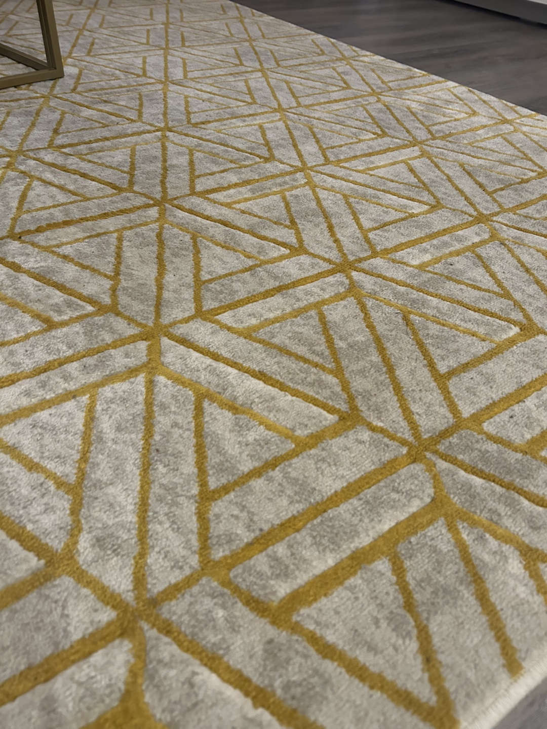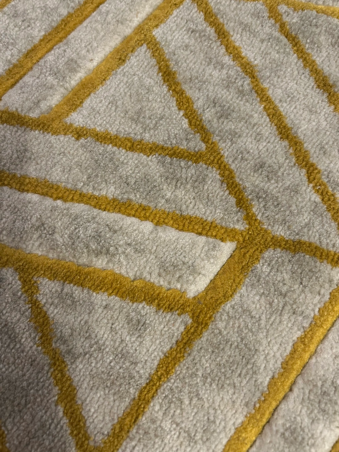 Stylish area rug. Grey and mustard yellow geometric pattern. Soft texture. Great for living room or bedroom.
