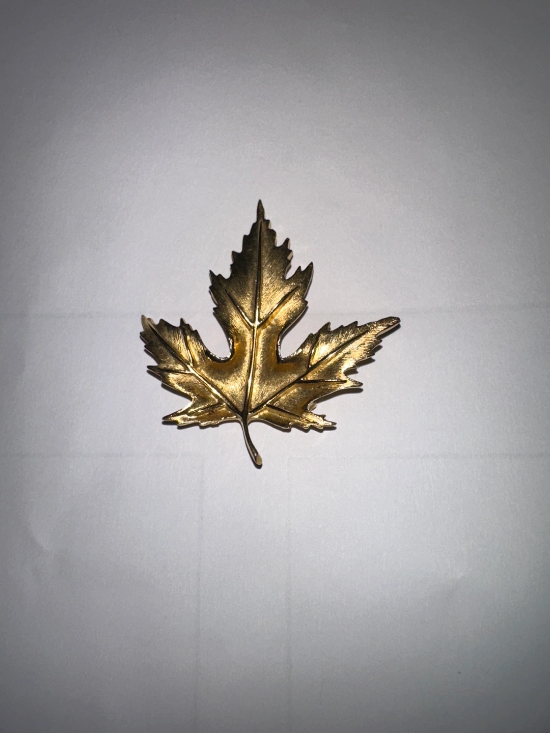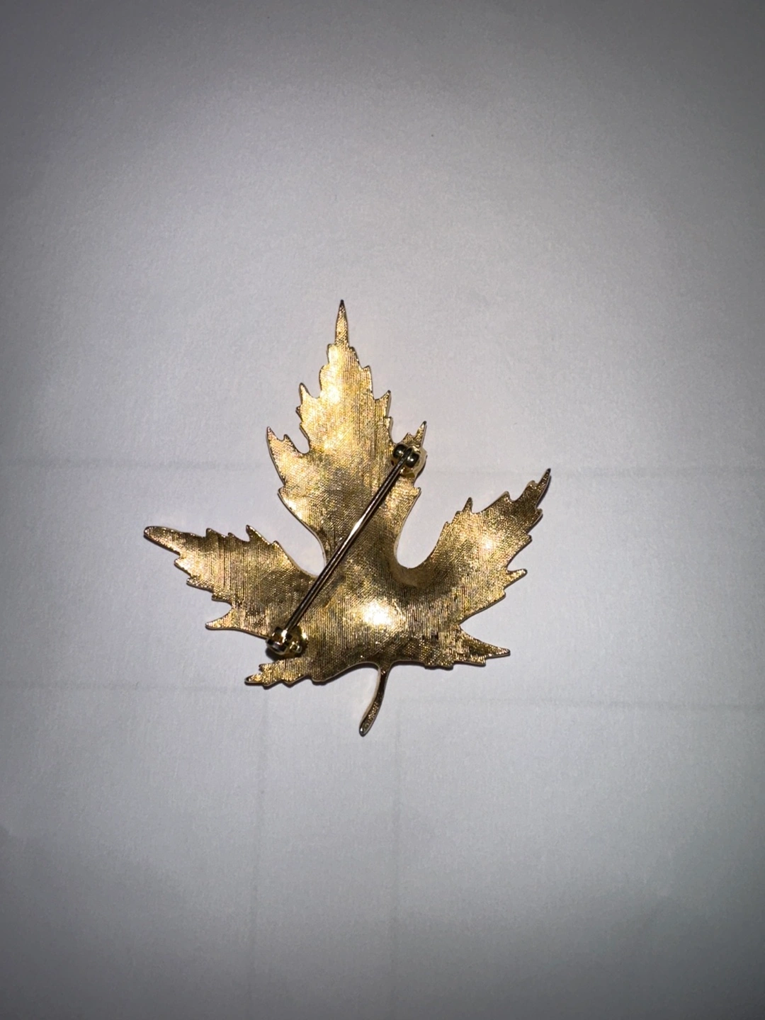 535Beautiful gold-tone brooch. Shaped like a maple leaf. Great for adding a touch of autumn flair to your outfit. Pin closure.