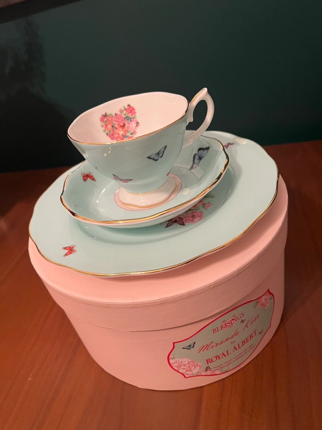 New (unused) Miranda Kerr Beautiful Royal Albert teacup, saucer and plate set. Features a lovely floral design with butterflies. Mint green colour palette. Comes in original box.