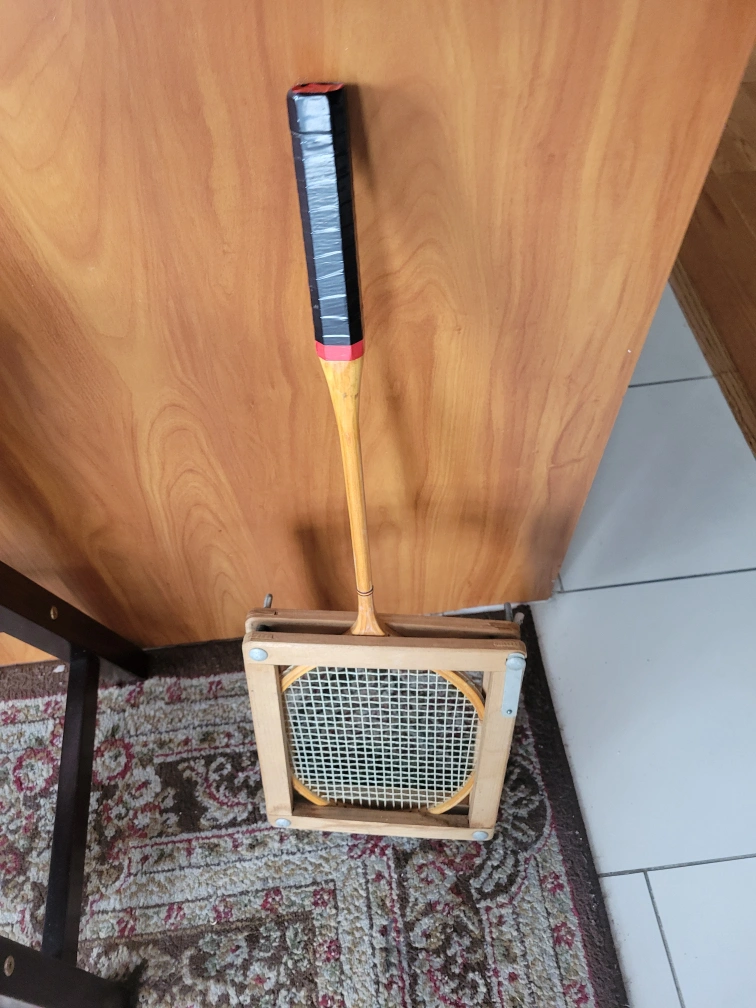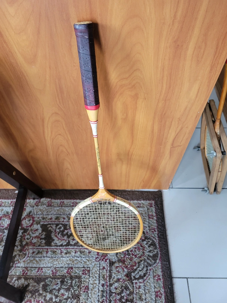 Cambridge and Power Flite Vintage Wooden Badminton Rackets with wood press.