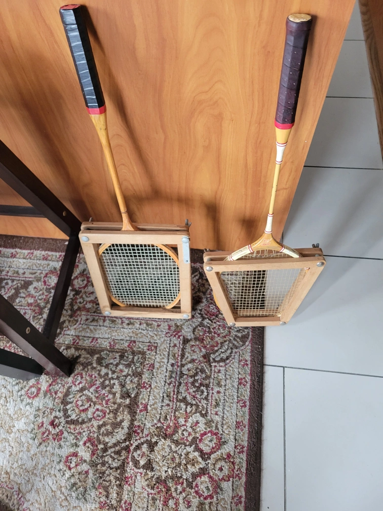 Set of two vintage badminton rackets. Both have square protective frames. Wooden construction. Good condition considering age.