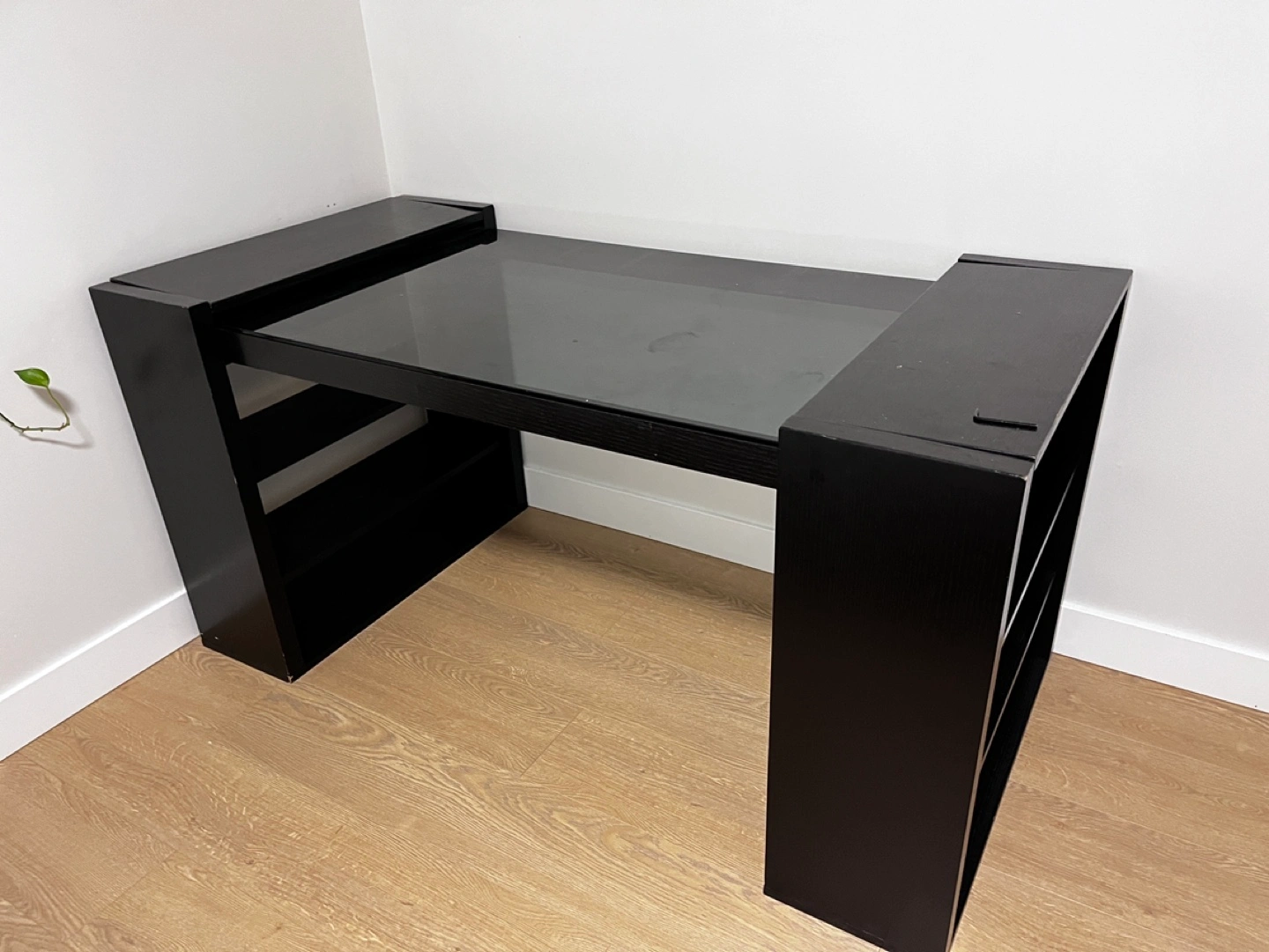 EQ3 Modern computer desk. Black frame, glass top. Open shelving on either side. Minimalist design. Perfect for home office or small space.