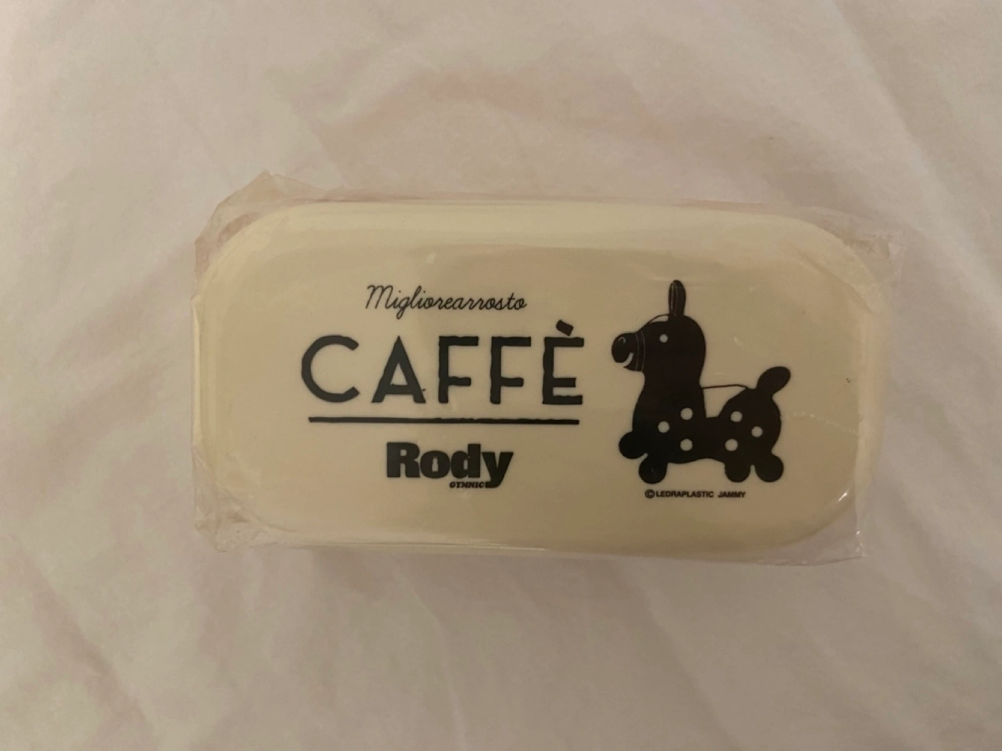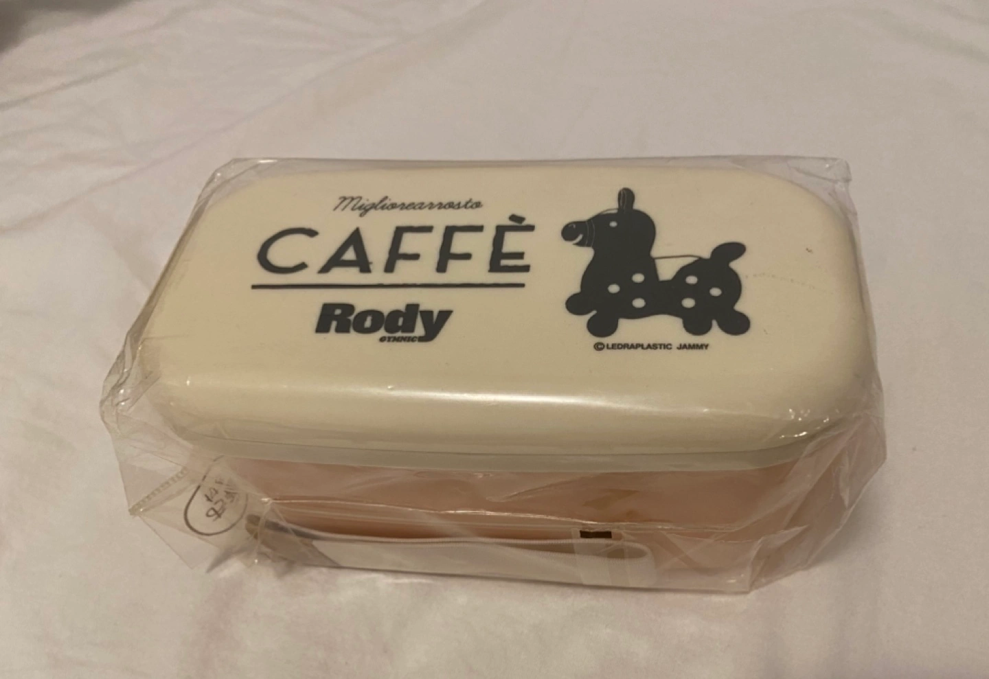 Bought from Japan. Adorable two-tiered bento box. Features a Rody the horse design and Caffè text. Brand new, still in plastic packaging. Includes elastic band.
