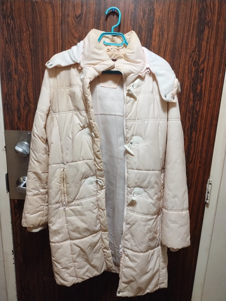 Light pink puffer jacket from Sears. Knee length, hood with sherpa lining. Zipper close along with toggle closures. Size small. In good condition, with some marks and staining (due to light colour) and still nice and warm.
