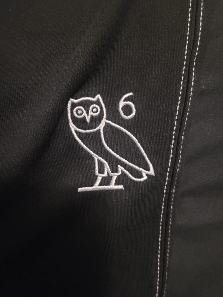 This XXL Black π¦ OVO Sweat Pants with an embroider Owl on the side of the pant leg.