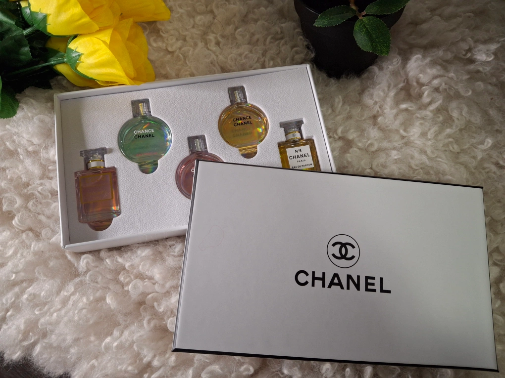 Four miniature Chanel perfumes. Chance Eau Tendre, Chance Eau Fraiche, Coco Mademoiselle, and N°5. Comes in original Chanel box. Perfect gift or for personal use or to gift to your love ones . 5 pieces in a box for $60