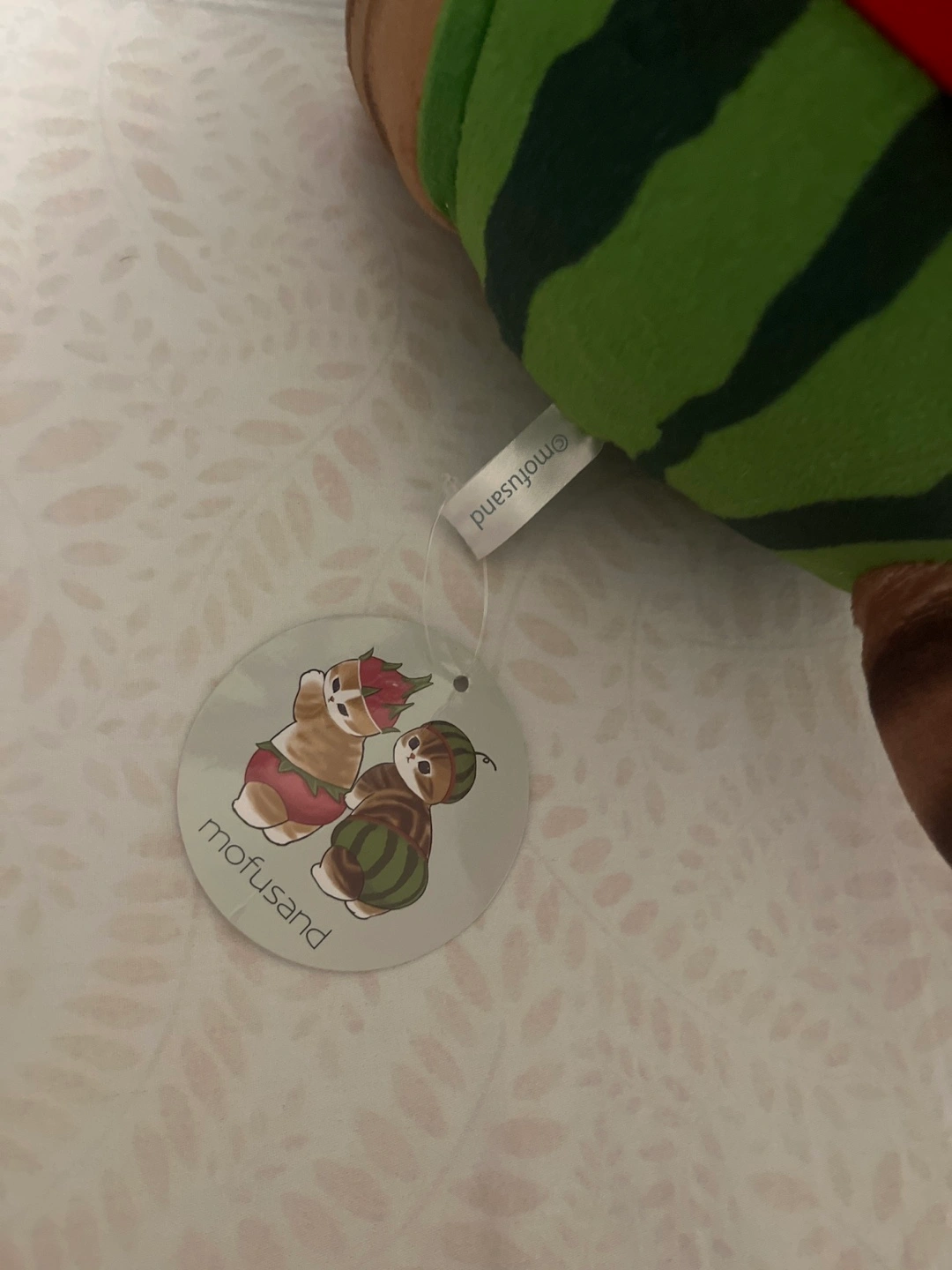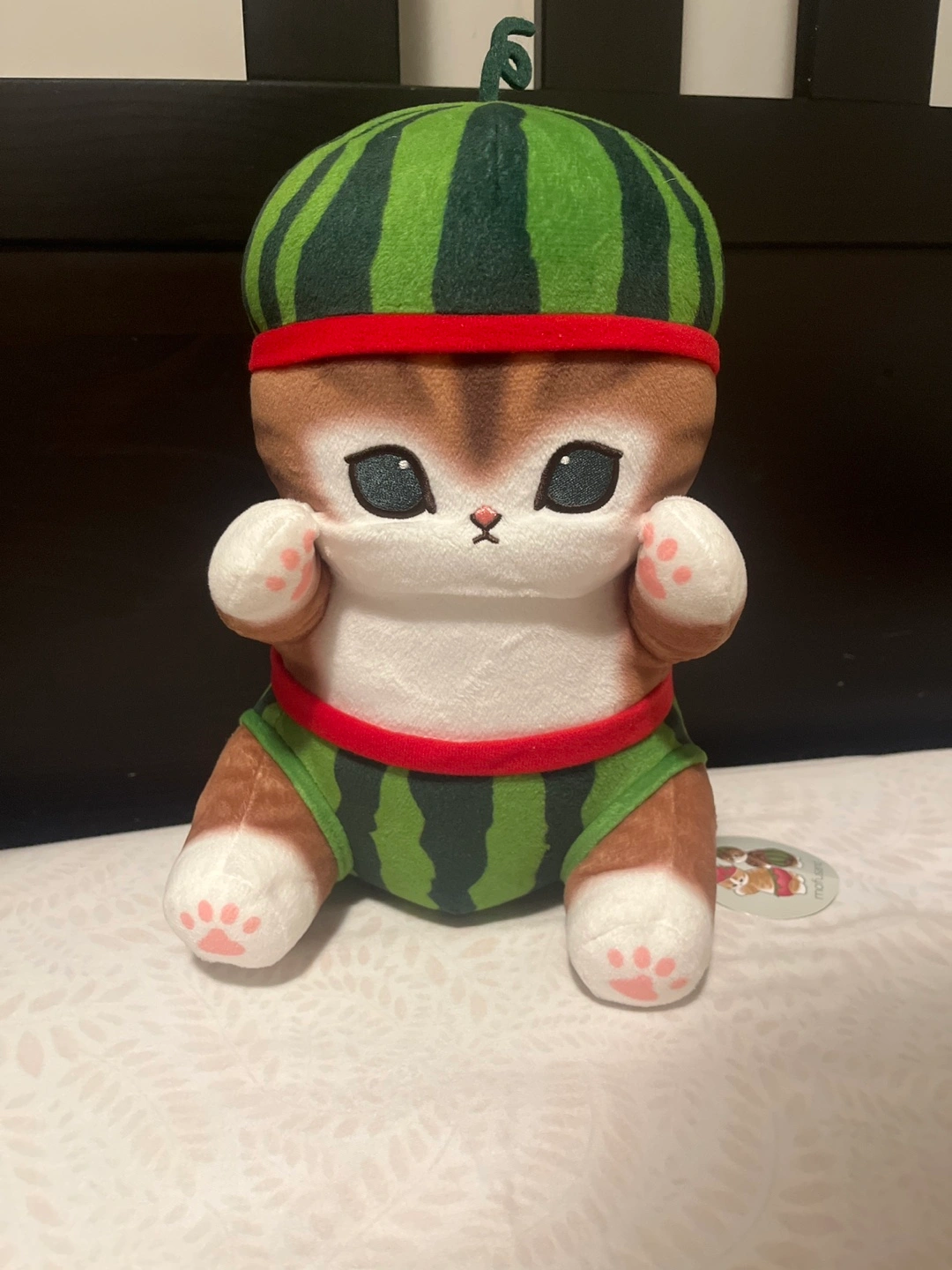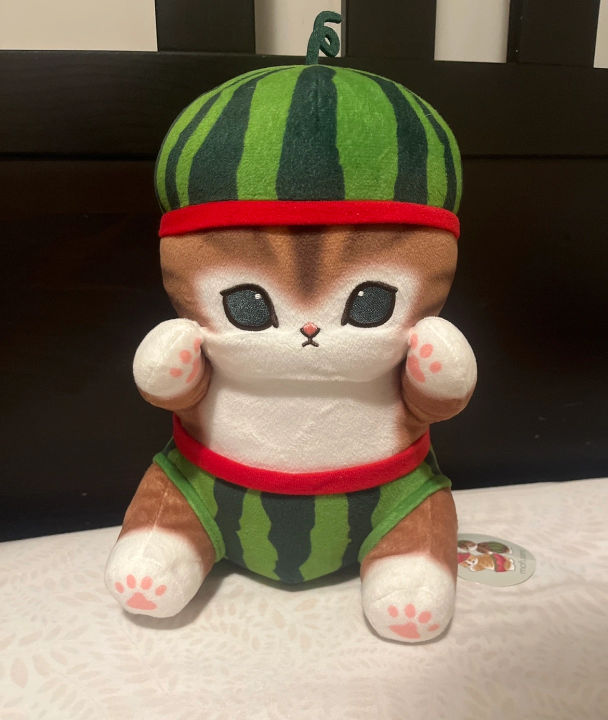This is a mofusand plush I brought from Japan. It features a cat wearing a watermelon costume.