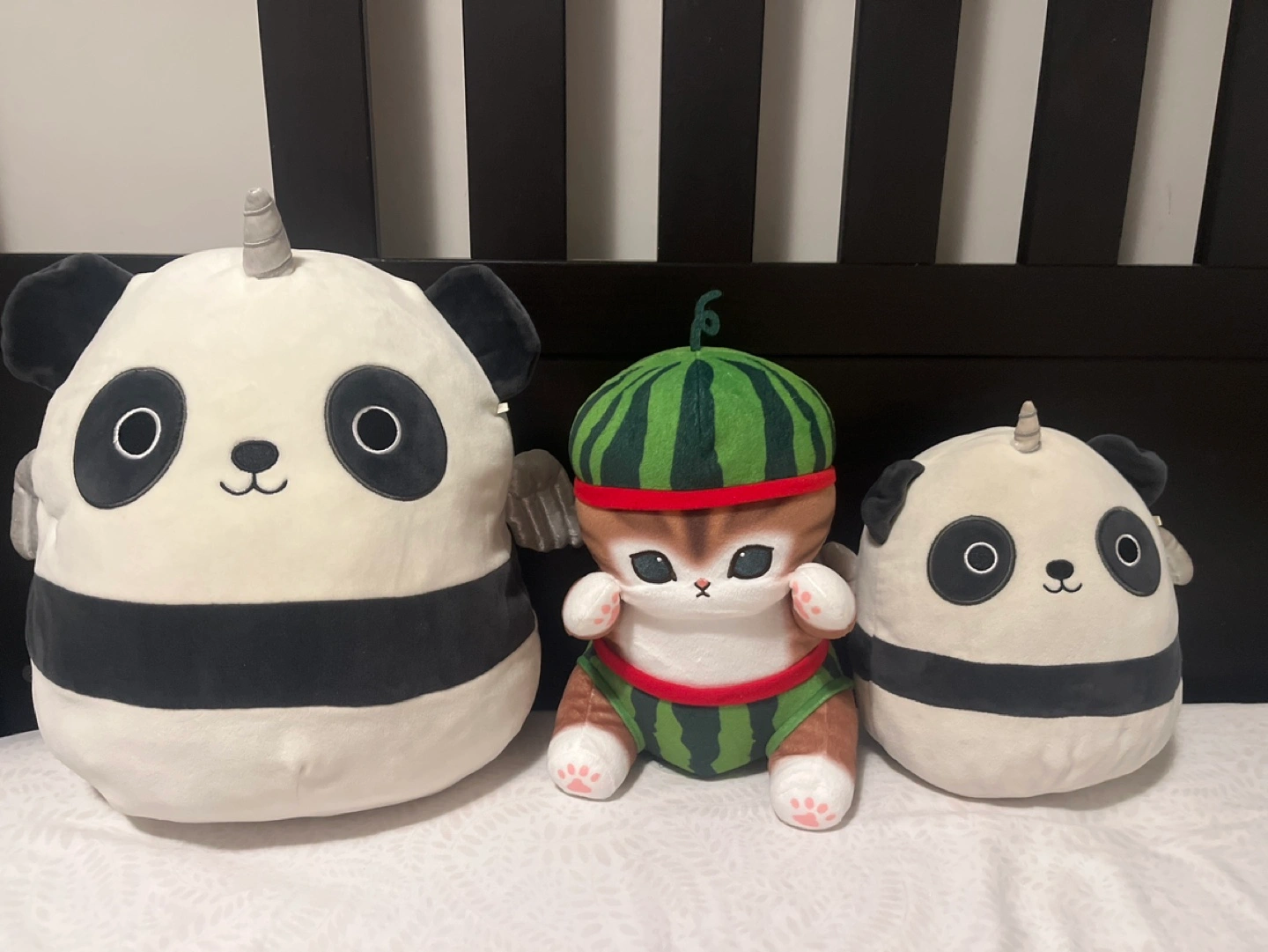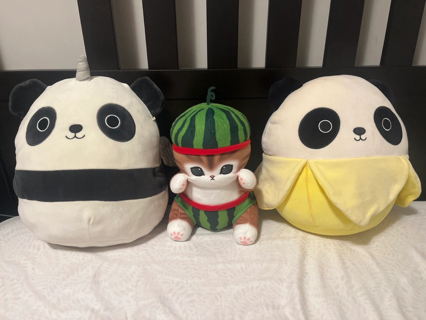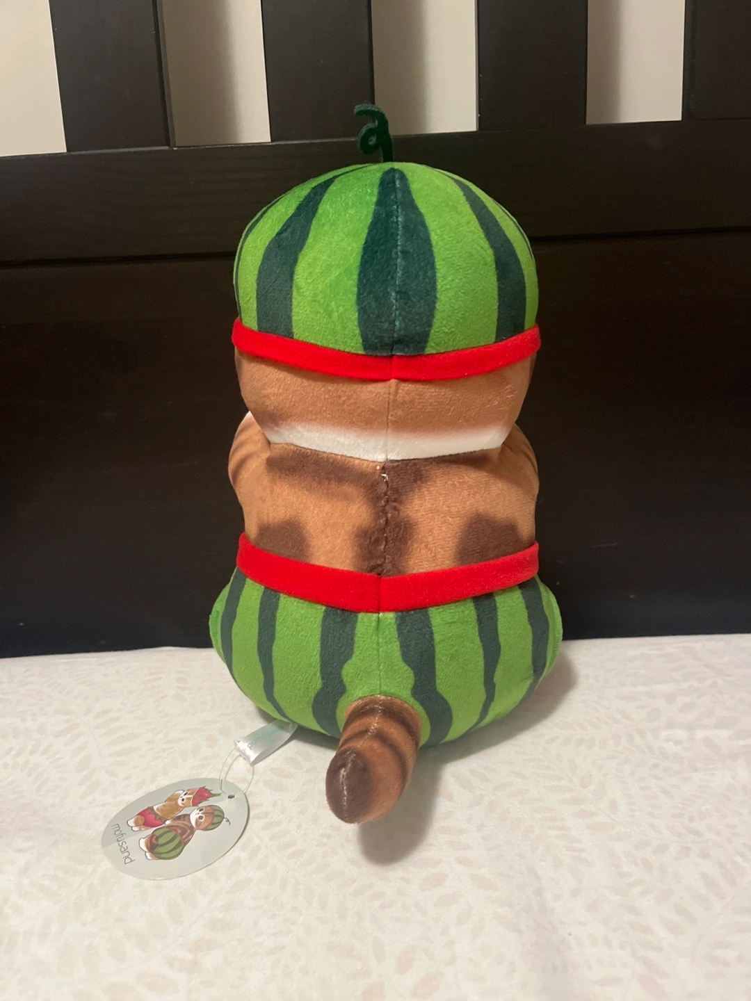 This is a mofusand plush I brought from Japan. It features a cat wearing a watermelon costume.