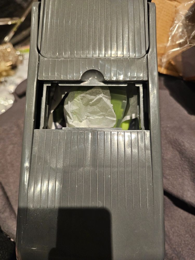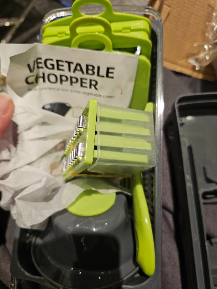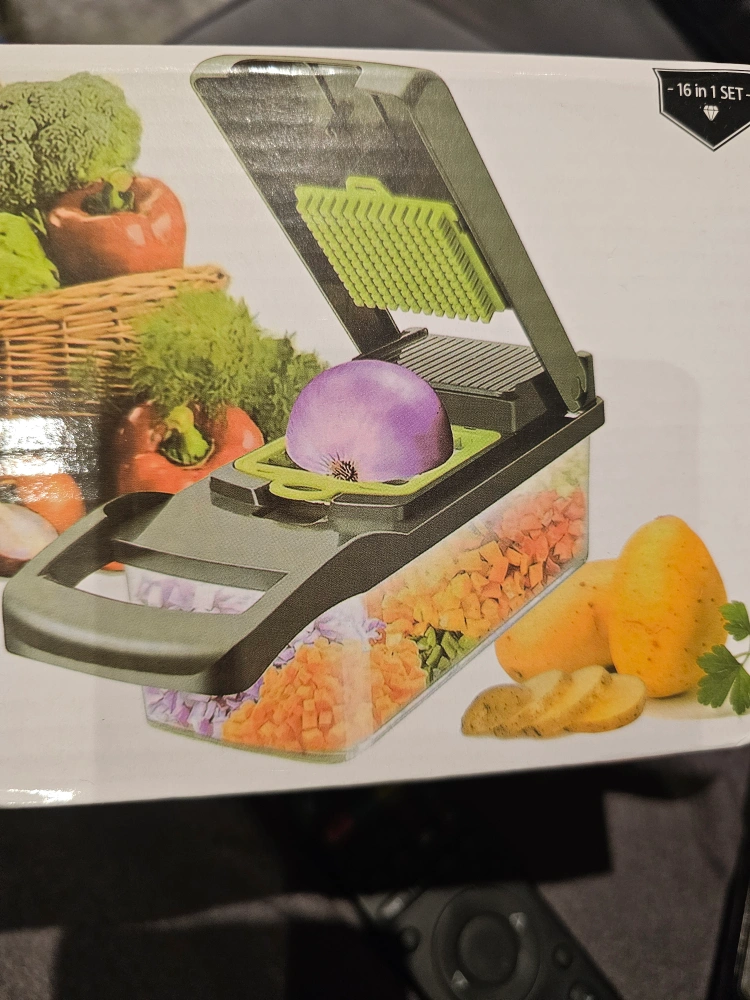 Multi-functional one-piece vegetable cutter. Includes various blades for chopping, slicing, and dicing. Compact and easy to store. Great for prepping vegetables quickly.