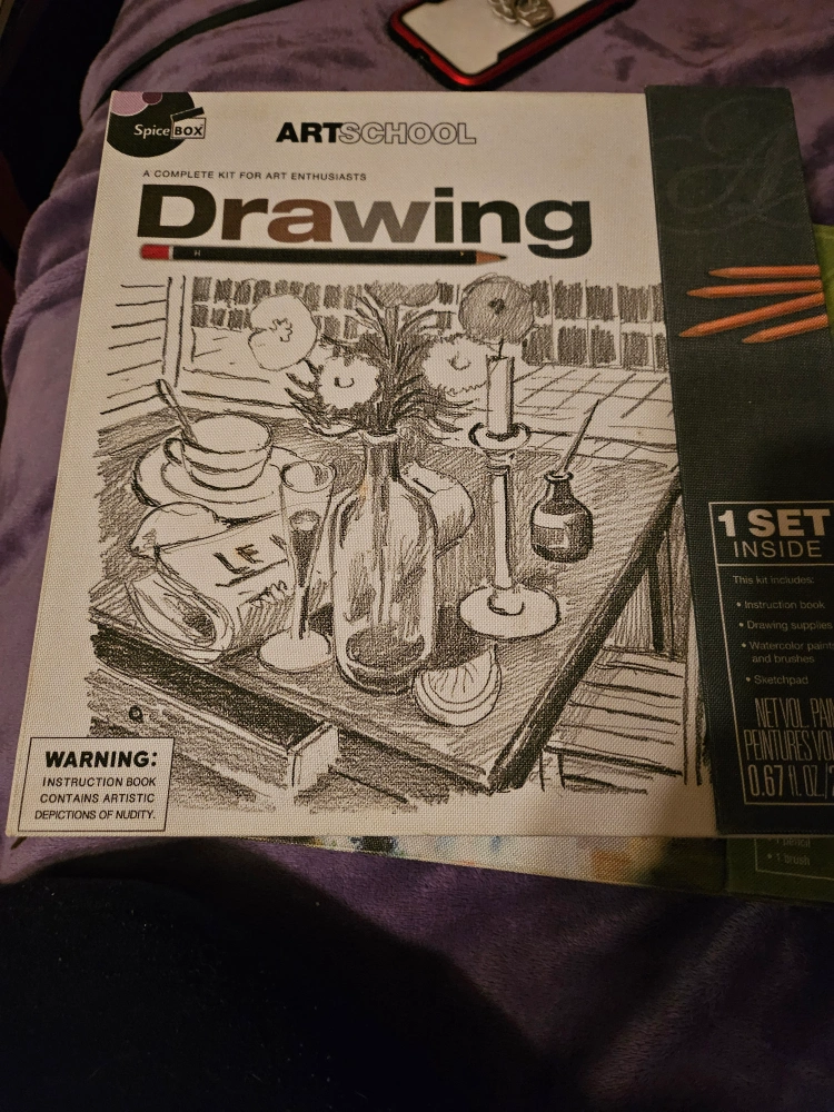 Complete drawing kit. Includes instruction book, pencils, charcoal pencil, felt tip pen, eraser, paint, brushes, and sketchpad. Perfect for beginners or experienced artists. Never been used, just missing one pencil.