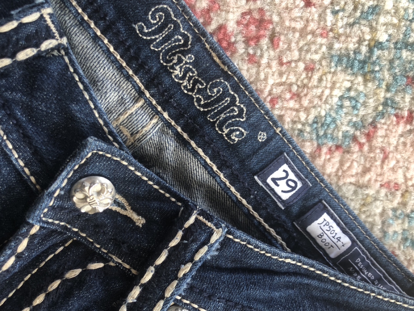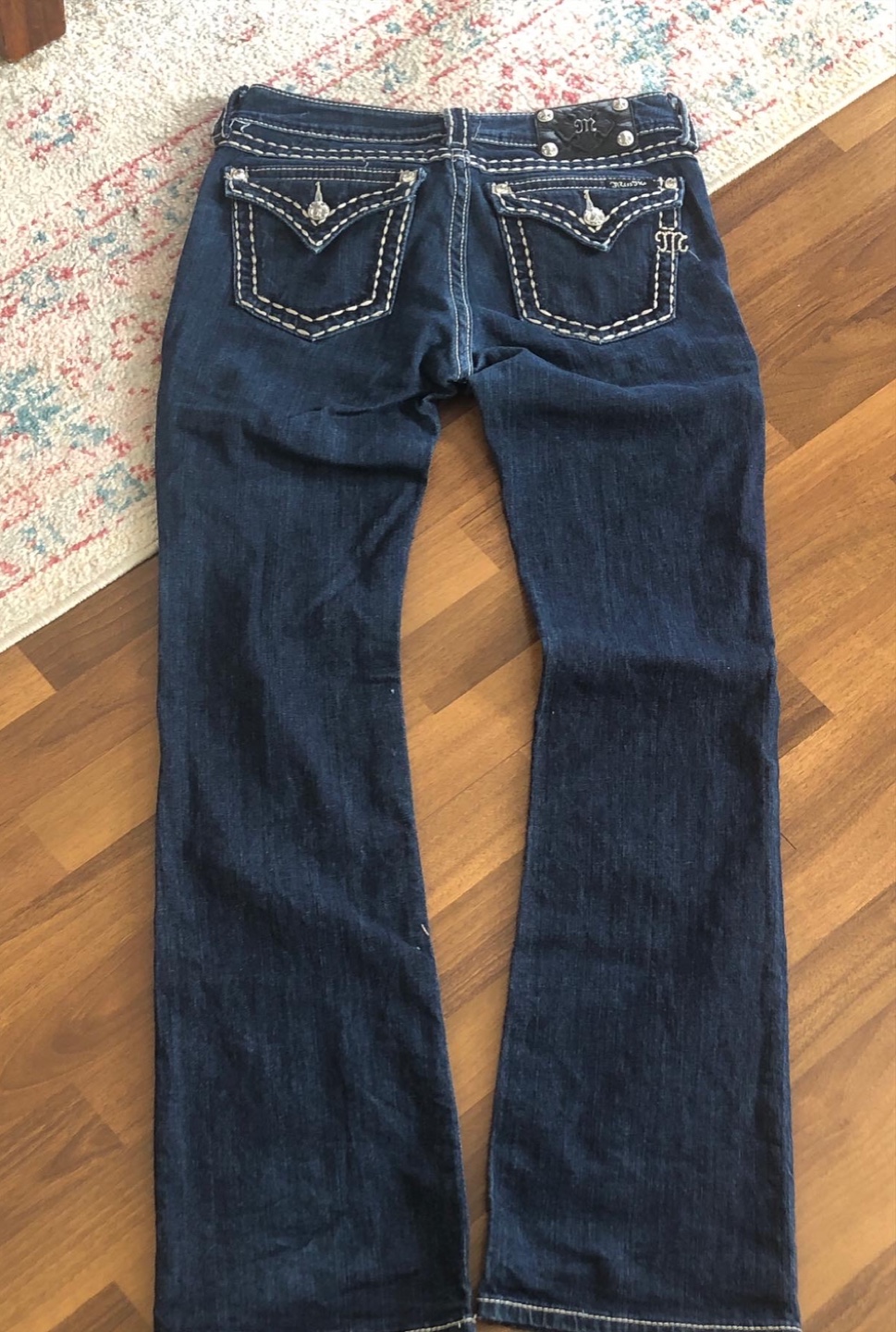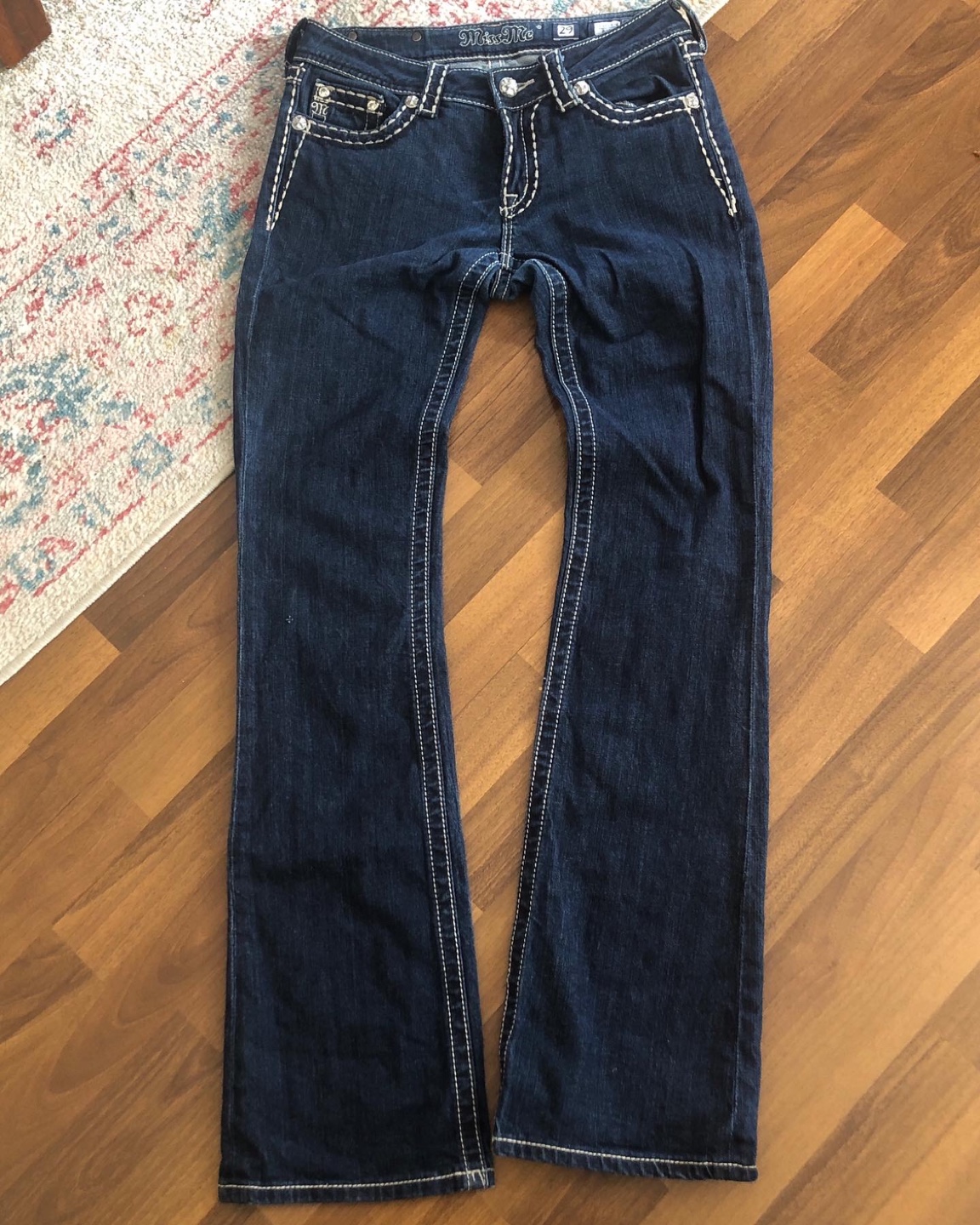 Dark wash bootcut jeans. Size 29. Miss Me brand. Embroidered details. White stitching accents.