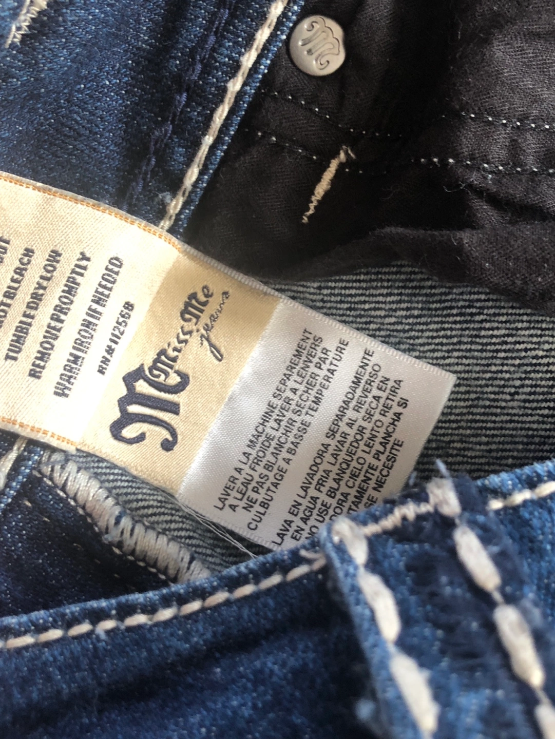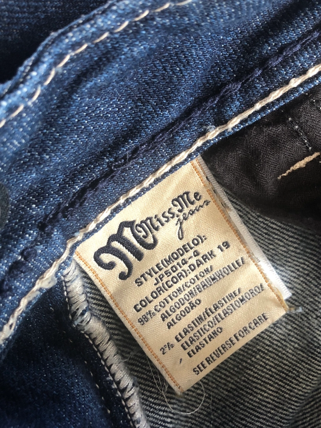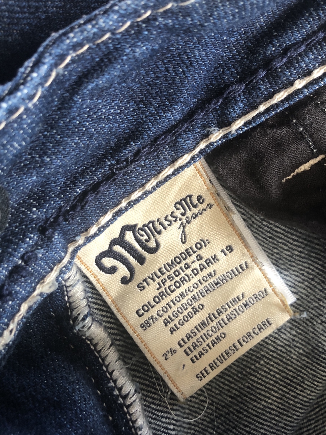 Dark wash bootcut jeans. Size 29. Miss Me brand. Embroidered details. White stitching accents.