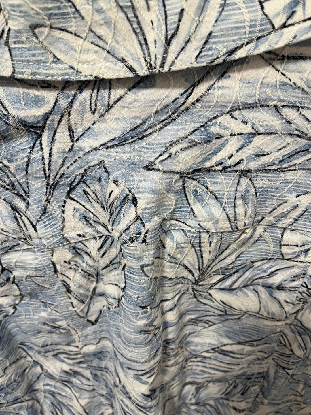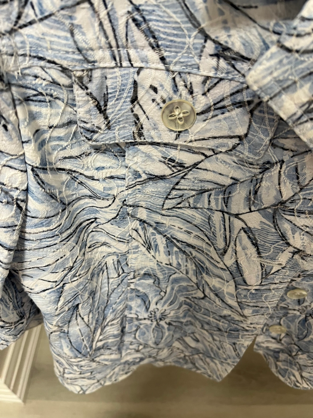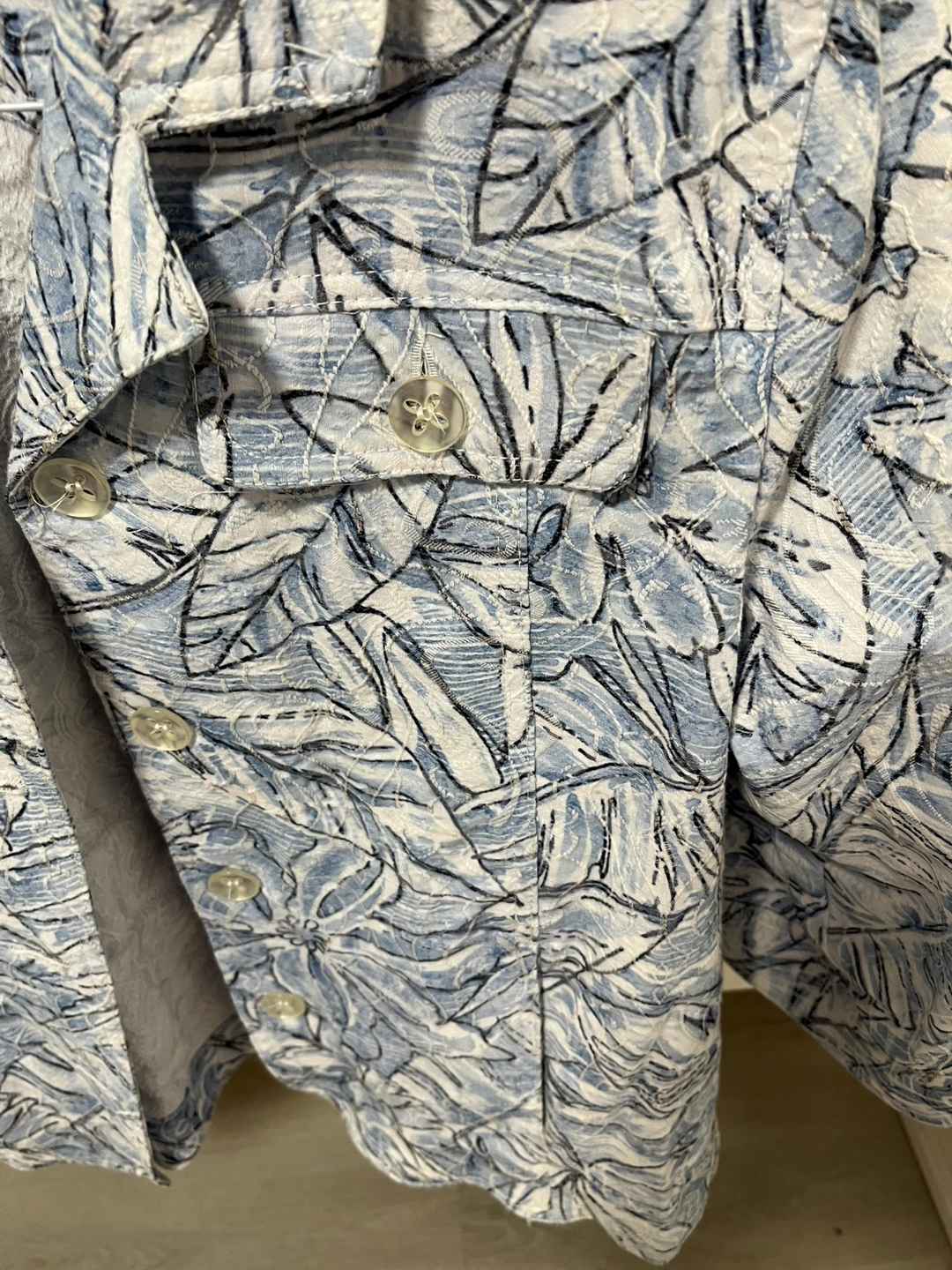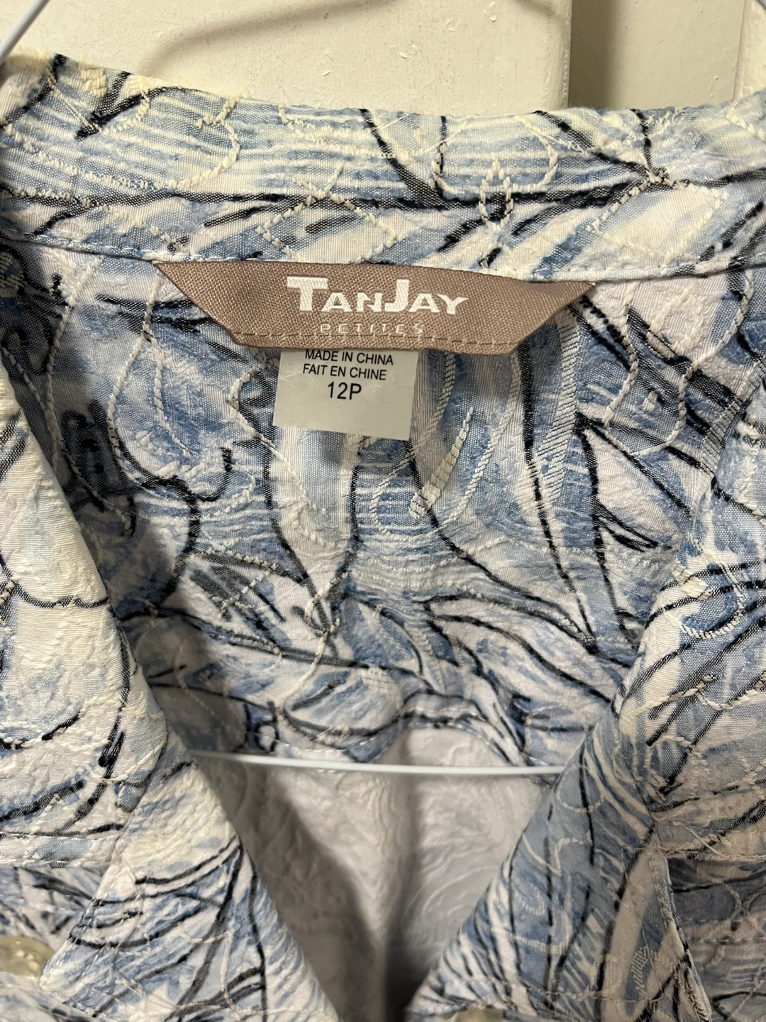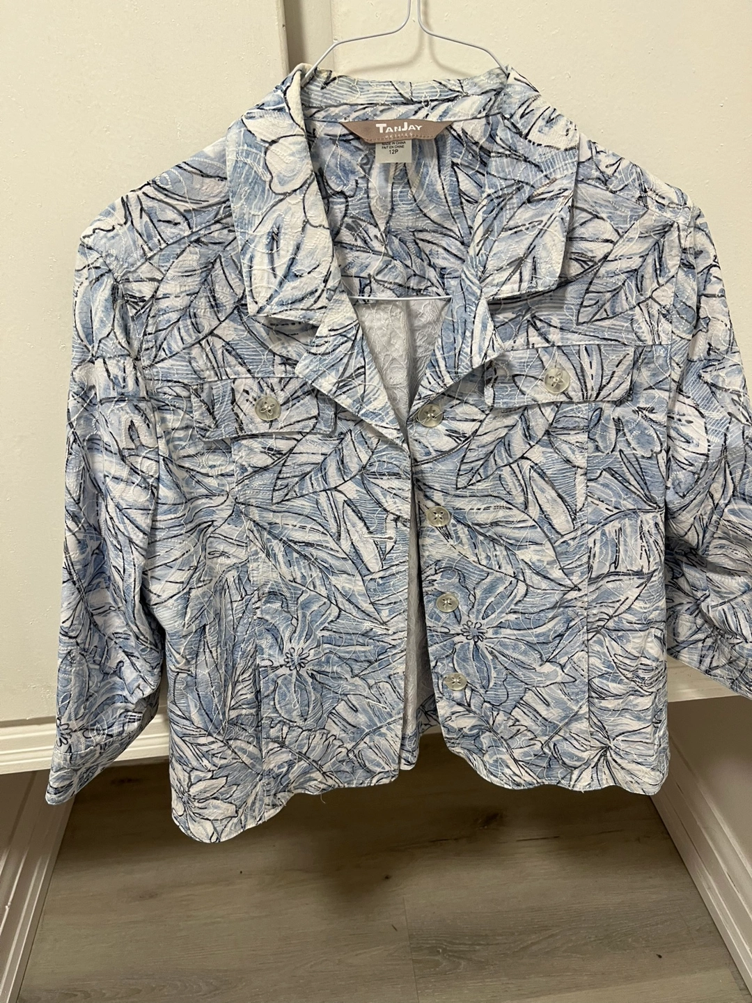 Beautiful blue and white floral print. Three-quarter sleeves. Button closure. Tan Jay Size 12P
