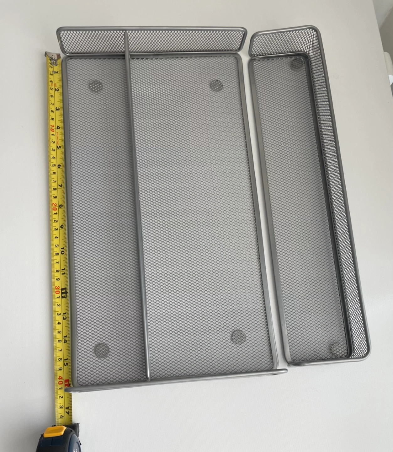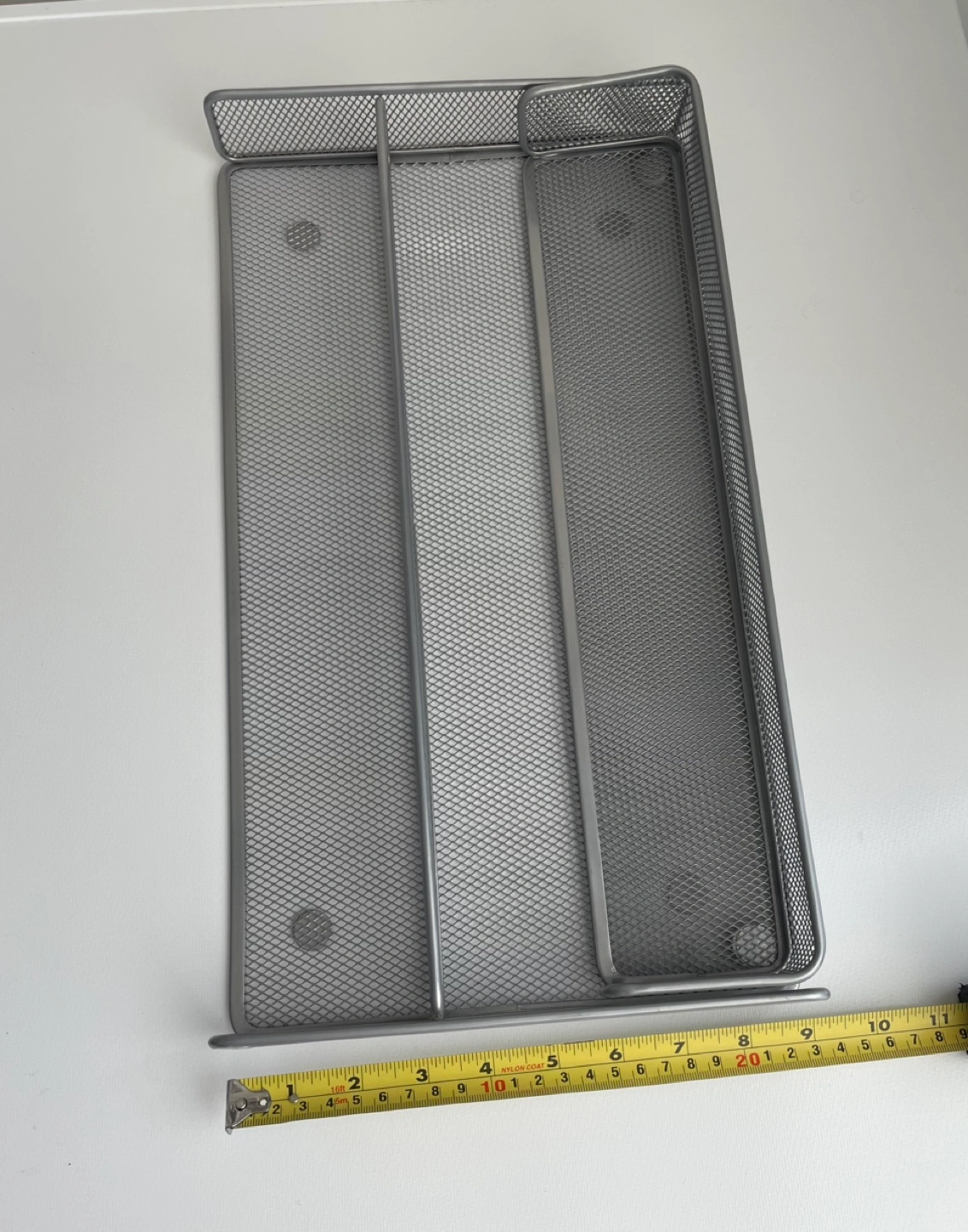 Three-compartment organiser. Silver metal mesh construction. Adjustable from 23-32cmX42cmX5cm. Easy to clean.