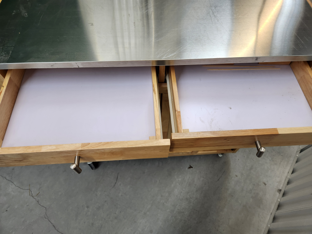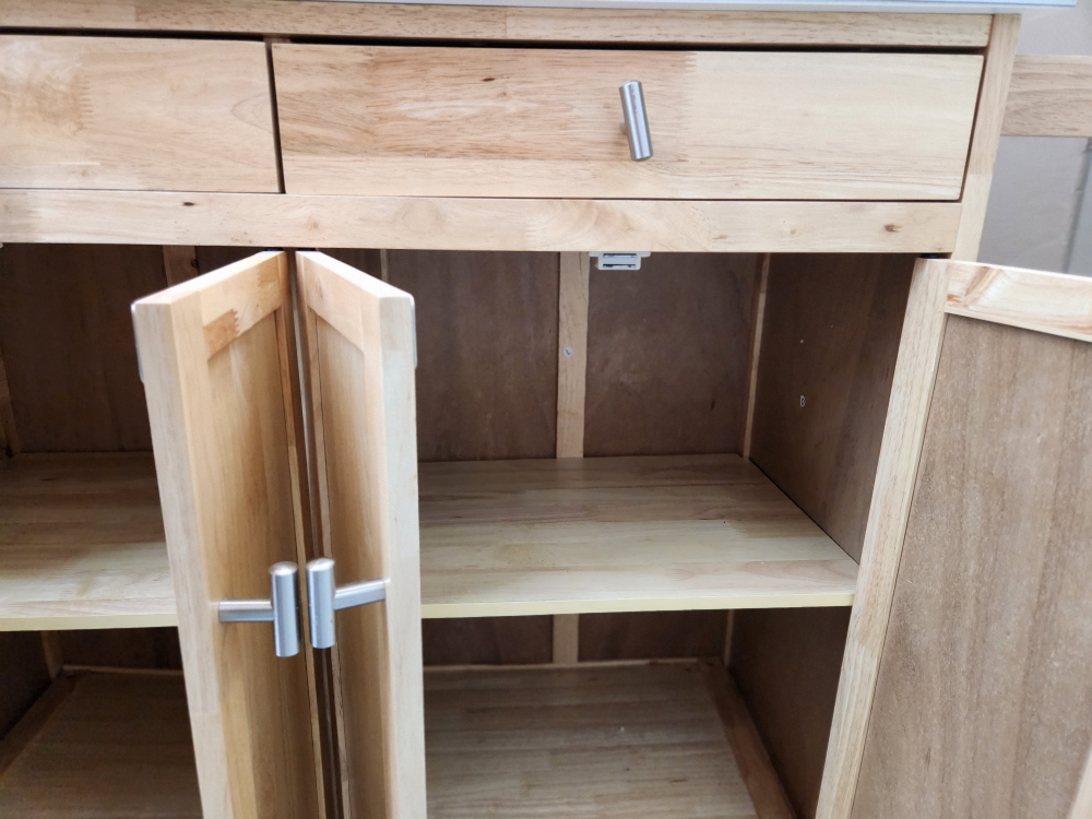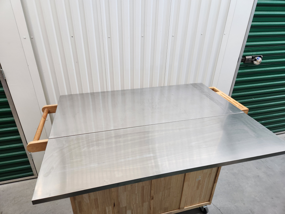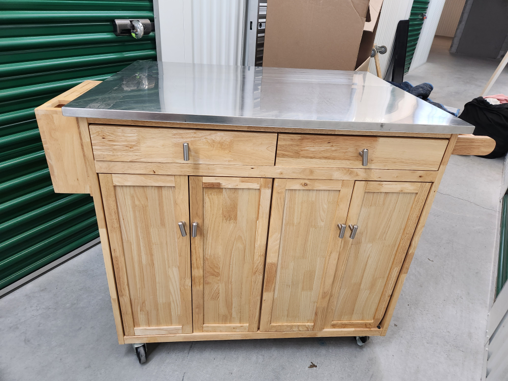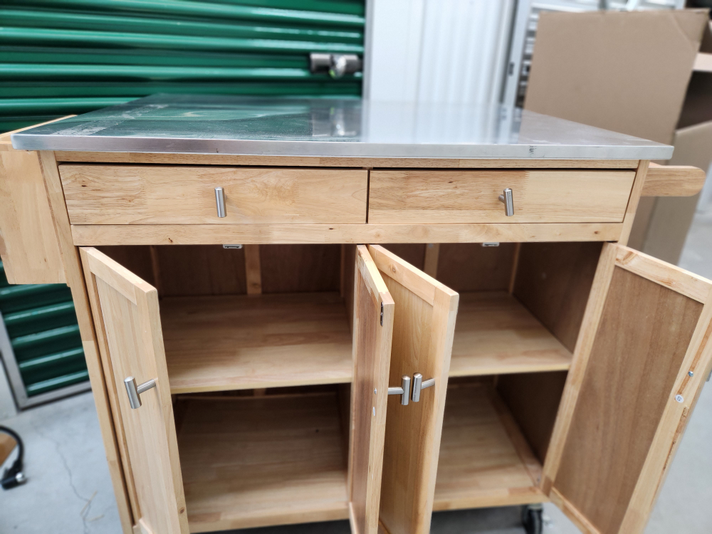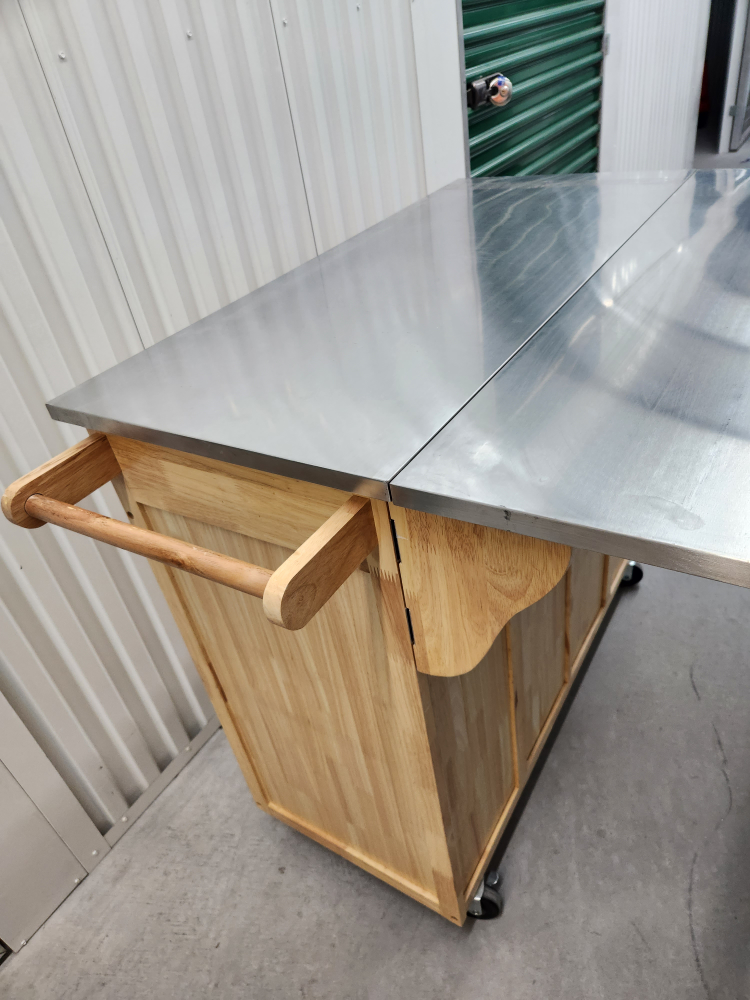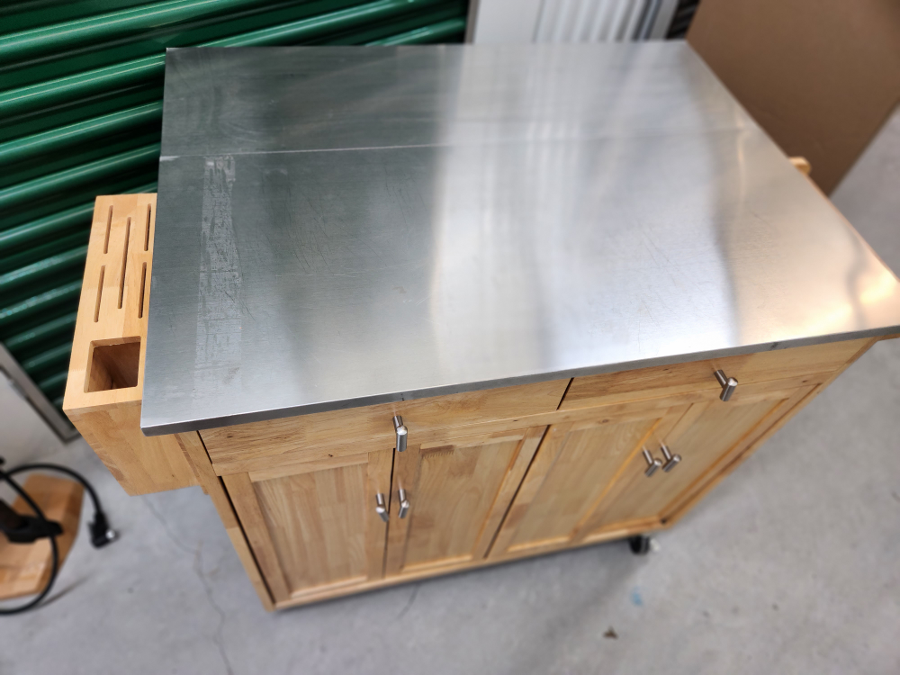 Rolling kitchen cart. Features stainless steel countertop, two drawers, and three cabinets. Plenty of storage. Wood construction. Wheels for easy mobility.
