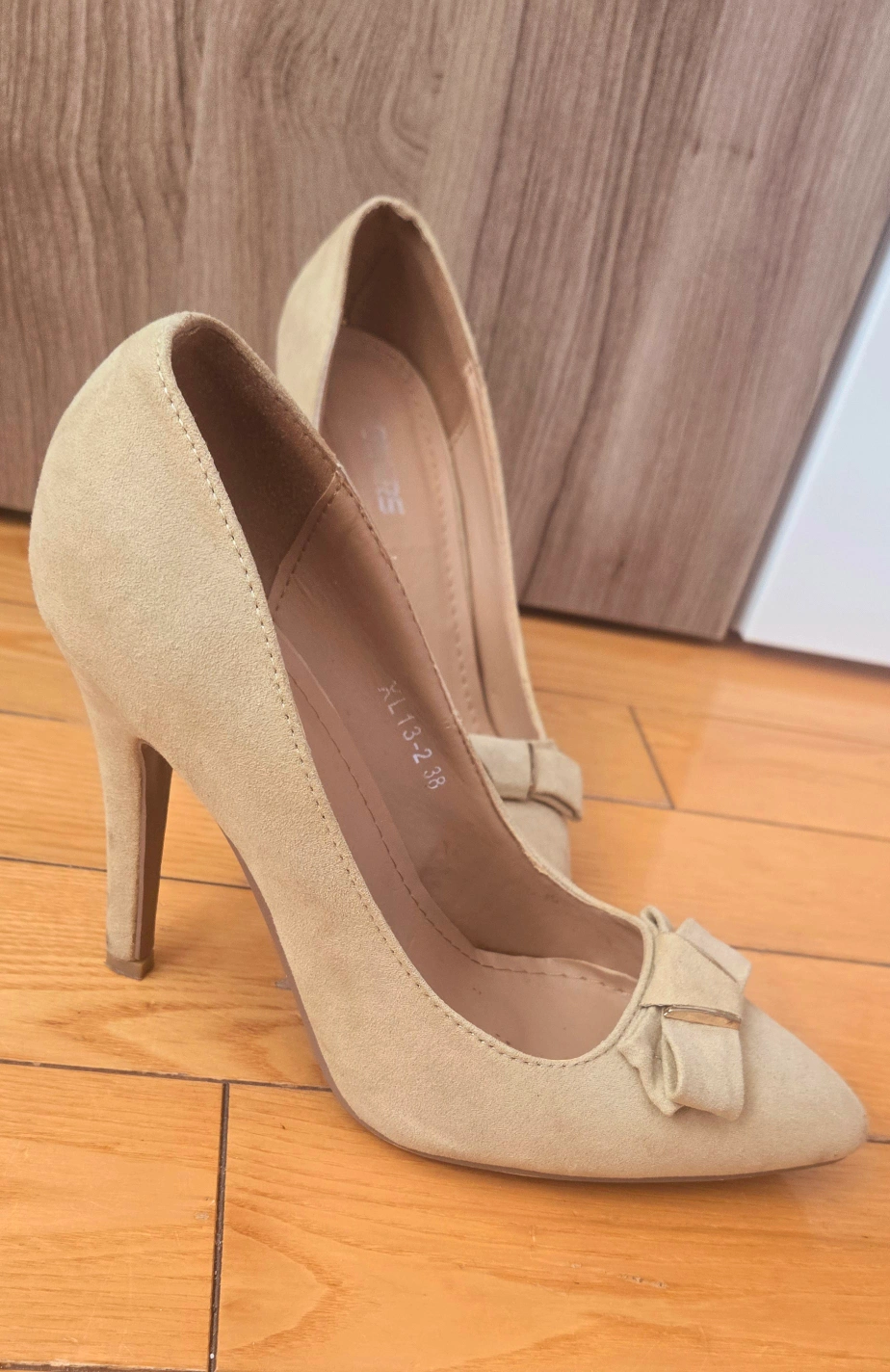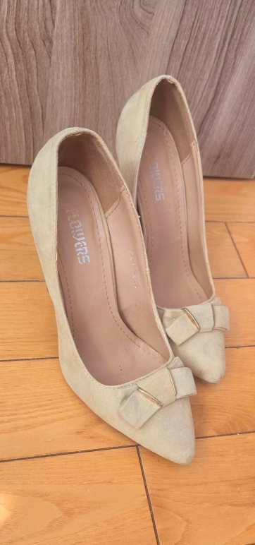 Pair of beige suede high heels. Pointed toe and thin stiletto heel. Features a small bow detail on the vamp.
