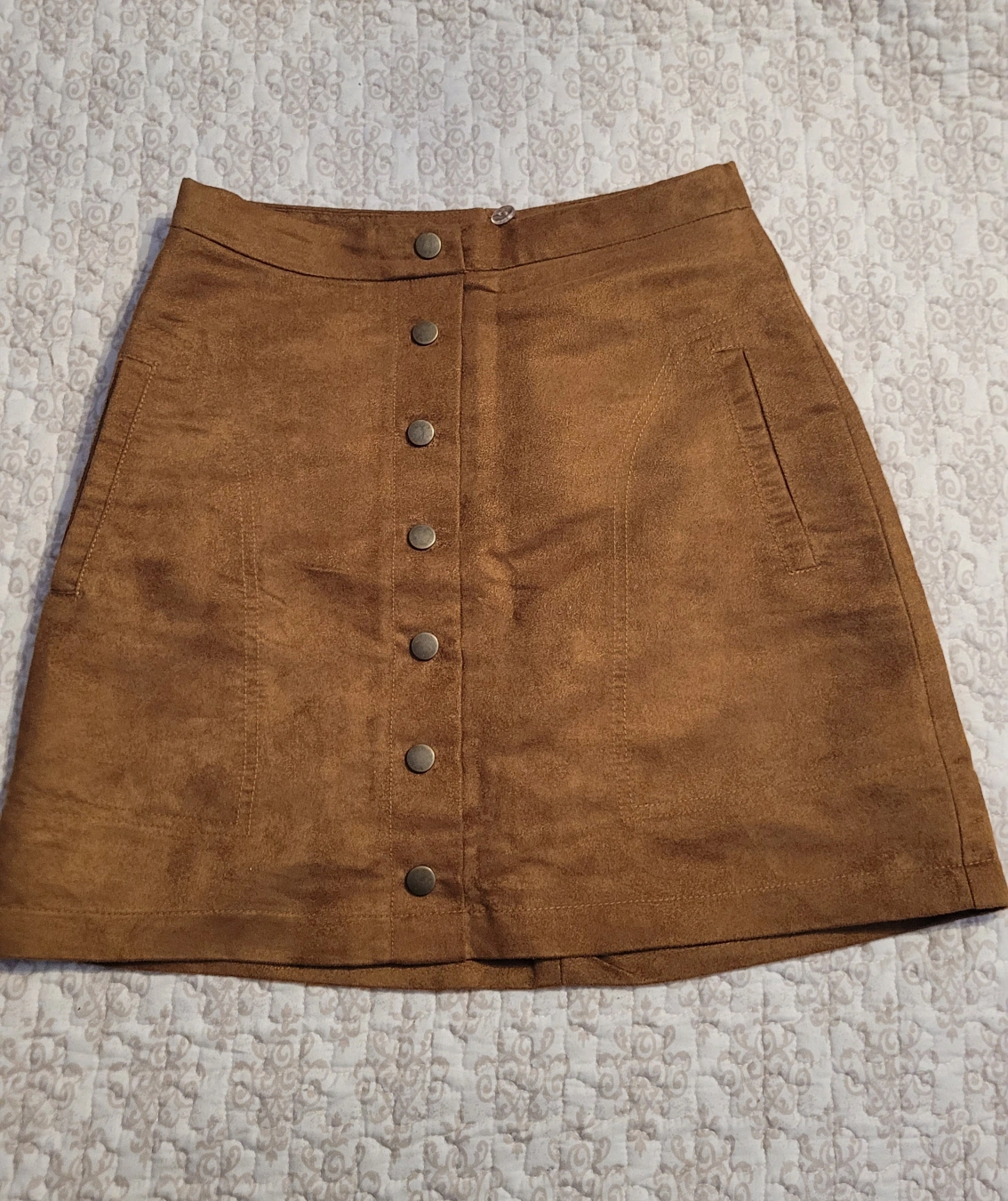 Women's mini skirt. Brown suede-like material. Button closure. Side pockets. Zipper closure. Fully lined.