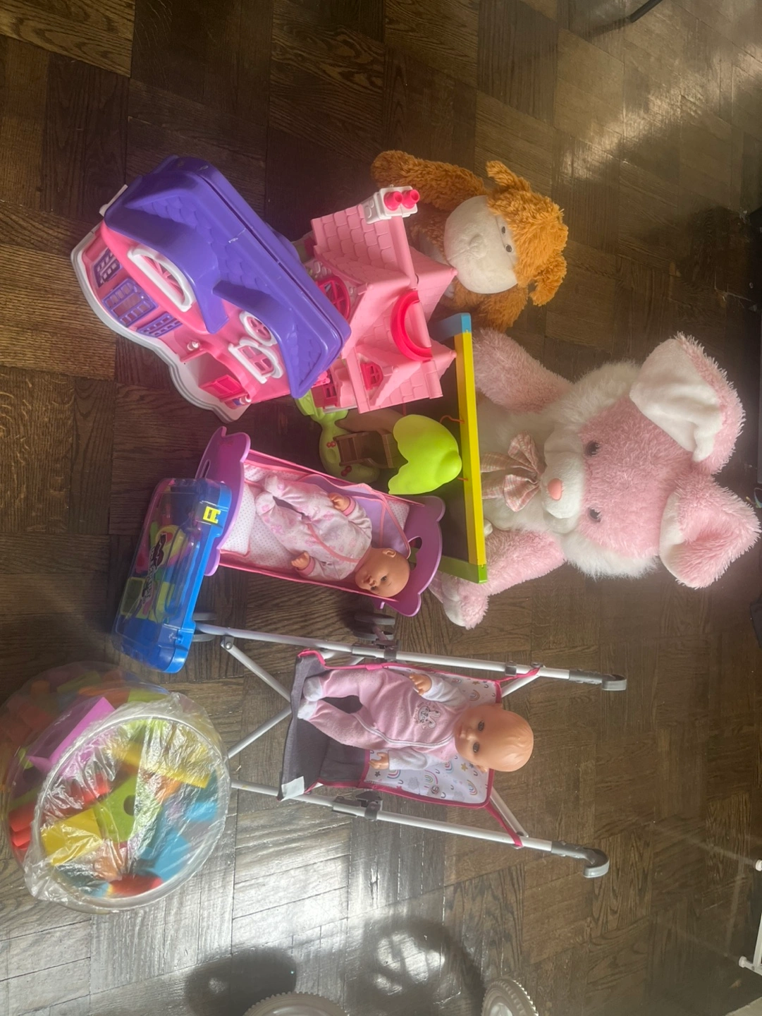 Large lot of baby toys. Includes two baby dolls, doll stroller, playhouse, toy car, large plush bunny and monkey. Also includes a container of blocks. Great for imaginative play!