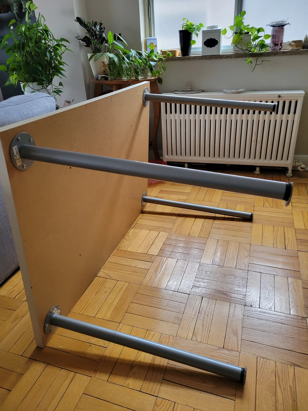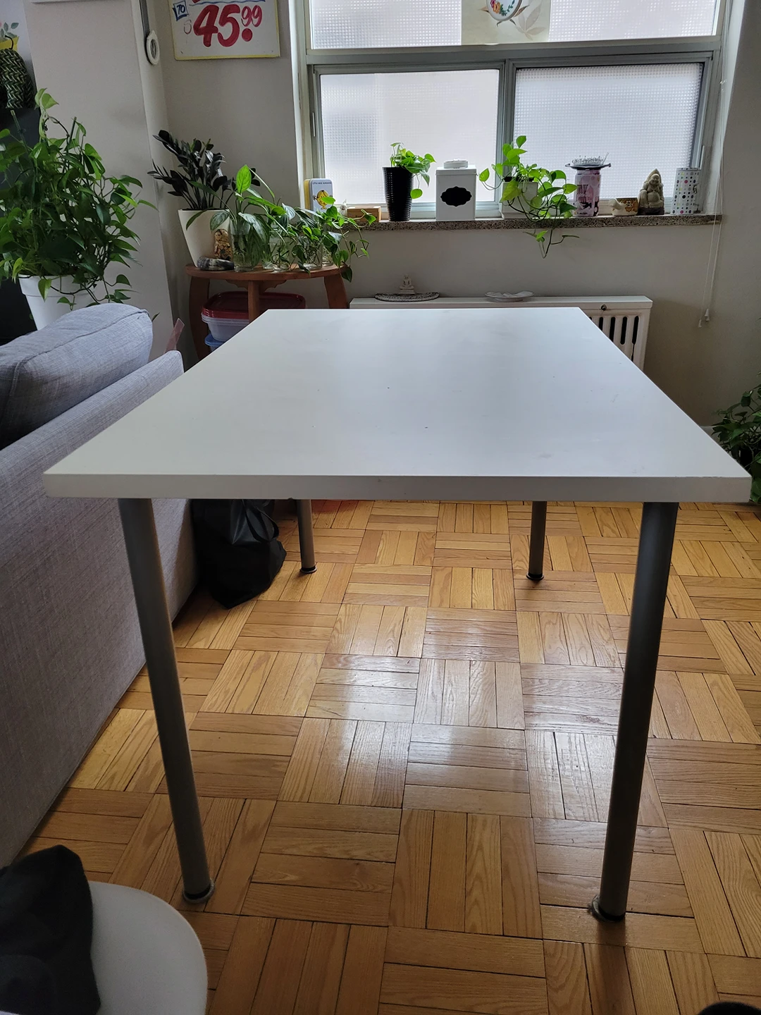 White ikea table. The table top has many scuffs (hard to see in pics). table is very sturdy, includes all hardware and legs. It has been taken apart for easy transport. pet free home