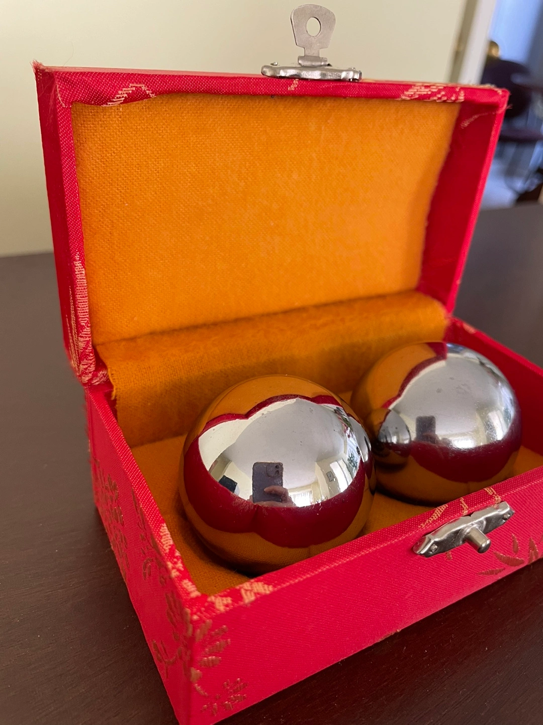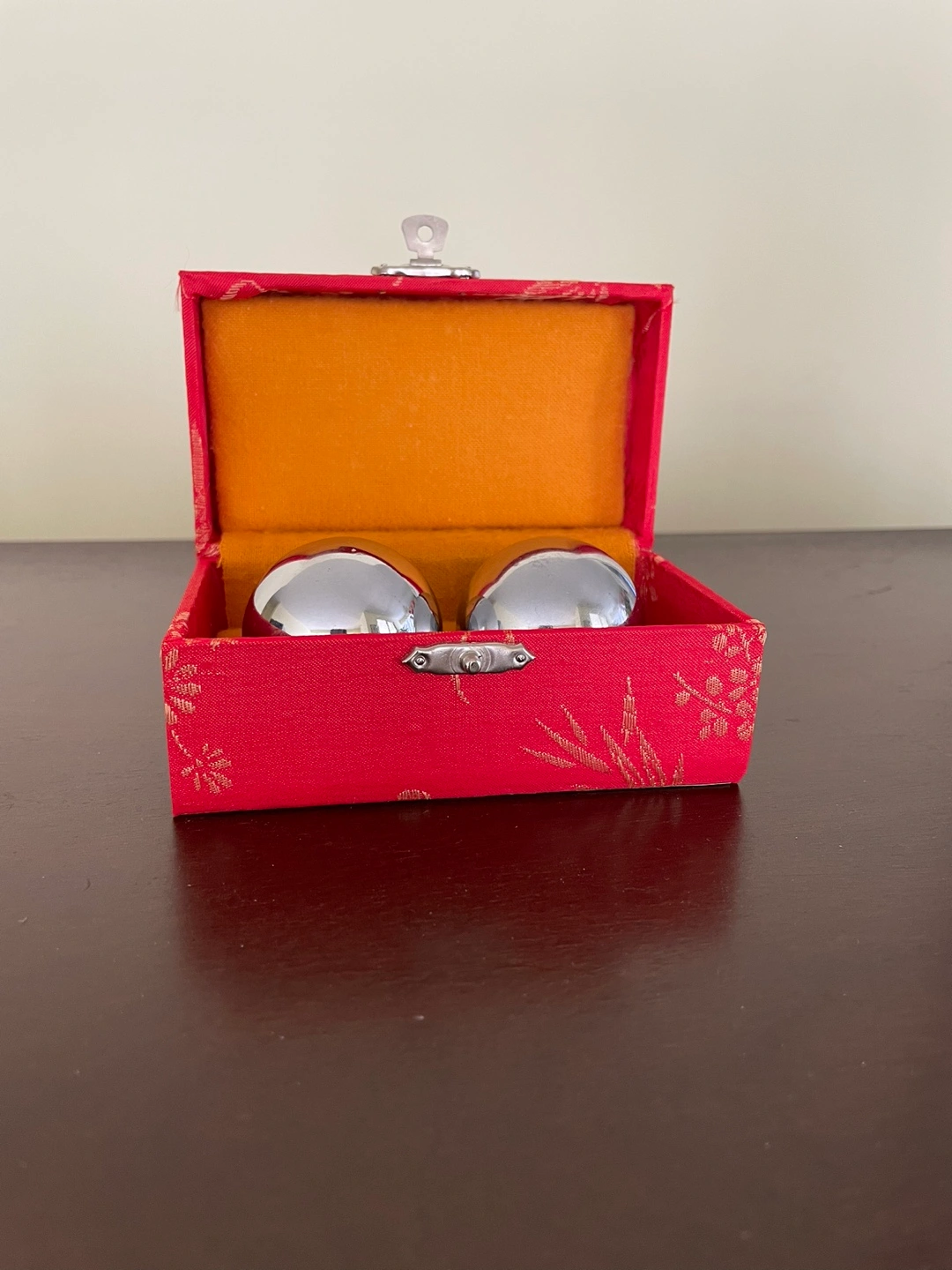 1000+Two metal balls in a red box. Designed for stress, insomnia, and arthritis relief. Made in China. Chinese balls of life," also known as Baoding balls or Chinese health balls, are small metal balls used for physical exercise and therapy, believed to improve hand dexterity, relax the hand, and aid in muscle strength and motor skill recovery.