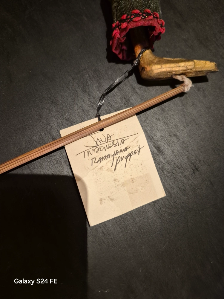 Vintage Indonesian Wayang Golek Puppet – Hand-Carved Ramayana Figure (Java, Mid-Century) Beautiful, hand-crafted Wayang Golek rod puppet from Java, Indonesia. This traditional puppet depicts a character from the legendary Ramayana epic, carved in wood with expressive detail and dressed in original batik costume. Complete with articulated arms, bamboo control rods, and vintage fabric embellishments. Likely created between the 1950s–1970s, this is an authentic piece of Javanese puppetry art, perfect for collectors of Asian artifacts, theater enthusiasts, or cultural decorators. Tag still attached: "Java / Indonesia / Ramayana puppets." Dimensions: [Insert Height] Condition: Excellent vintage condition – light wear consistent with age. Price: $175 (or best offer) ge Indonesian Wayang Golek Puppet – Hand-Carved Ramayana Figure (Java, Mid-Century) Beautiful, hand-crafted Wayang Golek rod puppet from Java, Indonesia. This traditional puppet depicts a character from the legendary Ramayana epic, carved in wood with expressive detail and dressed in original batik costume. Complete with articulated arms, bamboo control rods, and vintage fabric embellishments. Likely created between the 1950s–1970s, this is an authentic piece of Javanese puppetry art, perfect for collectors of Asian artifacts, theater enthusiasts, or cultural decorators. Tag still attached: "Java / Indonesia / Ramayana puppets." Dimensions: [Insert Height] Condition: Excellent vintage condition – light wear consistent with age. Price: $175 (or best offer) Available now at: Finer Things by Late Nite Auctions 1926 West 4th Ave, Vancouver, BC Located in the Arbutus Walk Shopping District