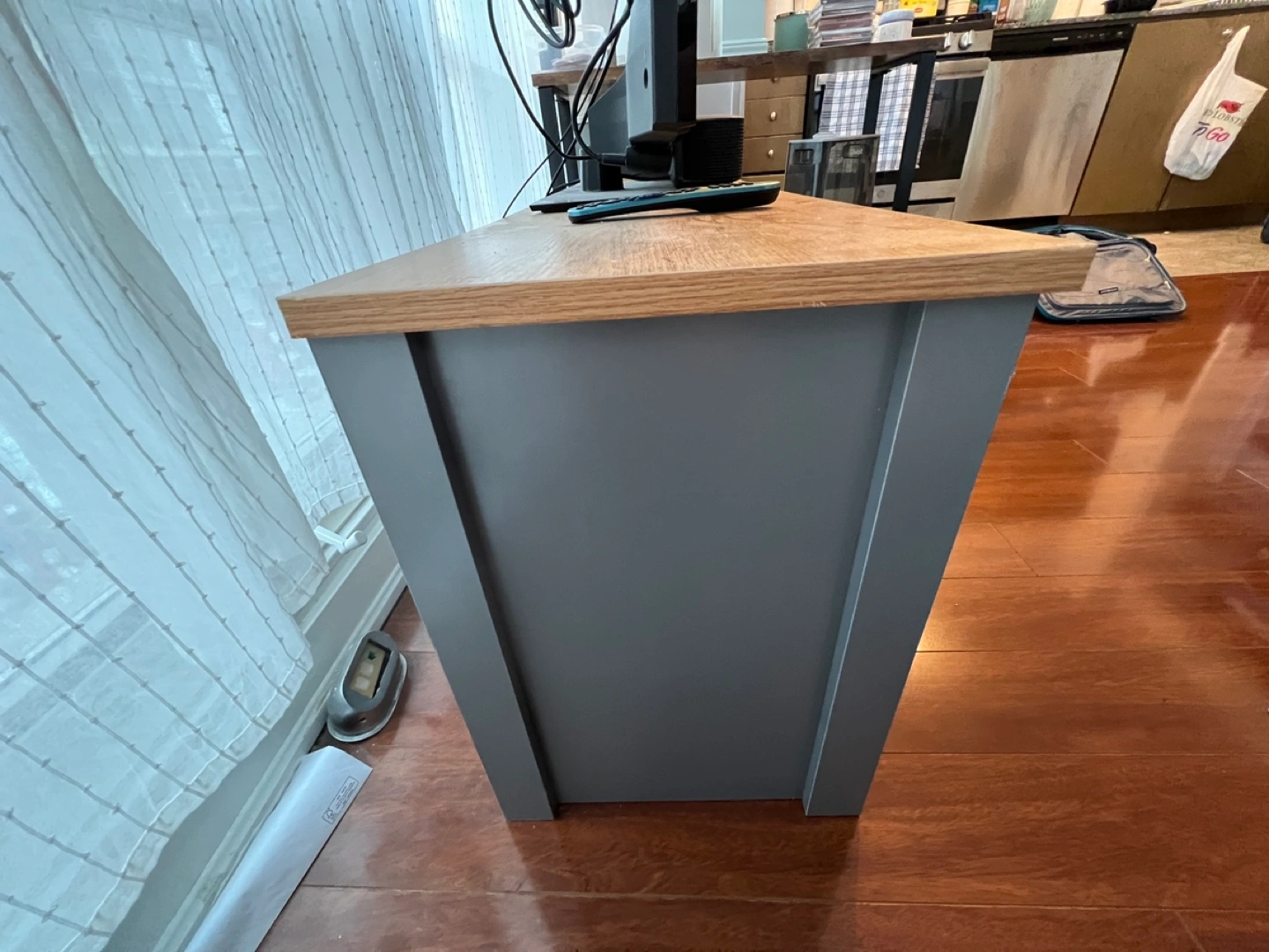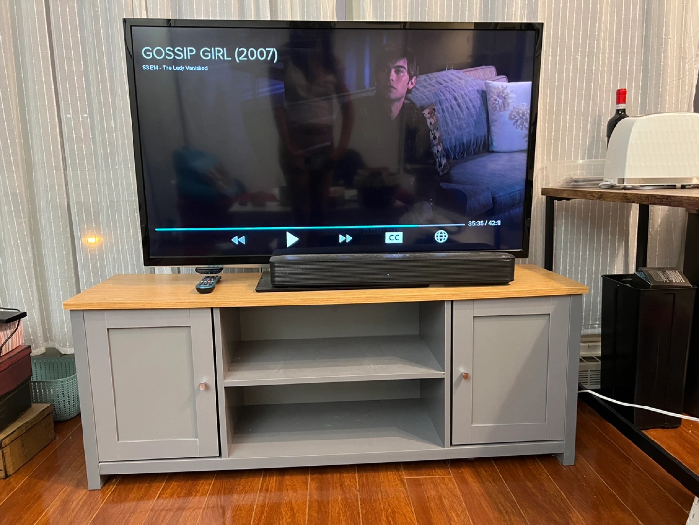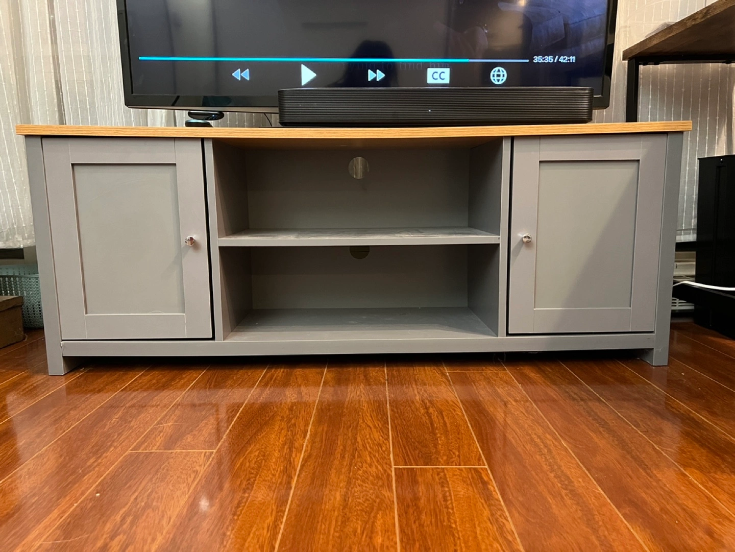 Grey and Vinyl Wood media console.