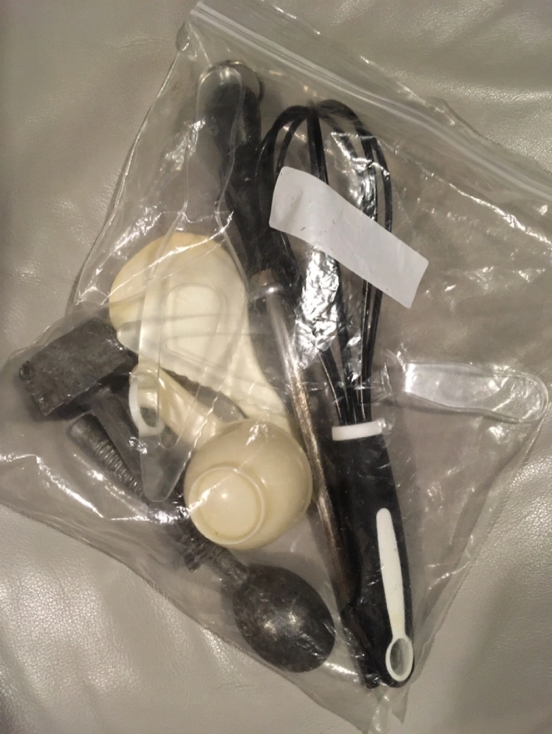 Bag of various kitchen gadgets. Includes whisk, measuring spoons, and other small utensils. Great for baking or everyday cooking.