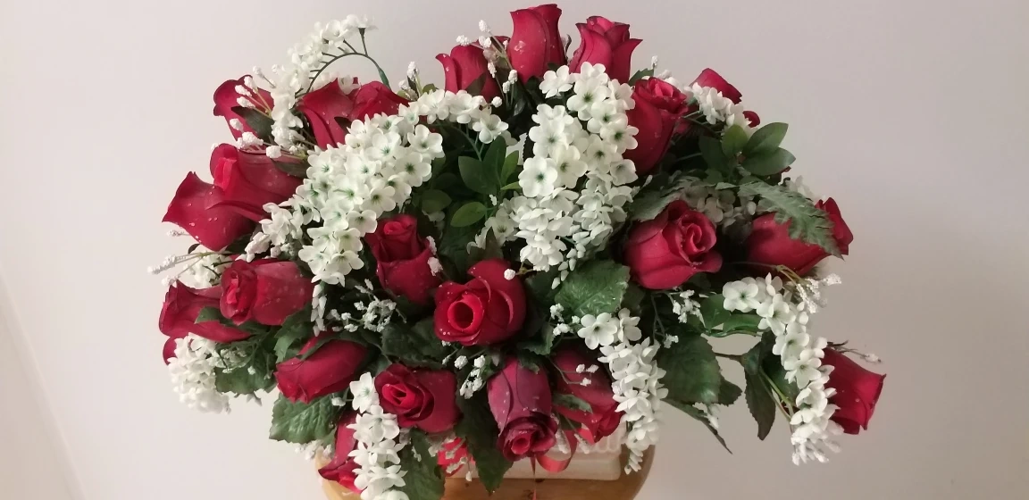 Beautiful artificial floral arrangement. Features many deep red roses and white baby's breath. Arranged in a container. Perfect for any occasion.