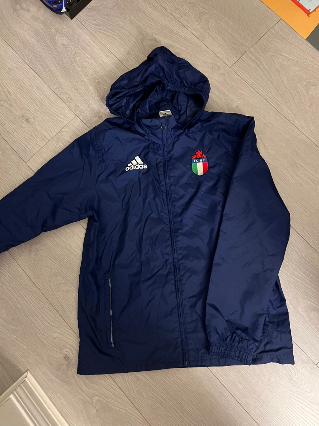 98Youth Adidas track rain jacket. Navy blue colour. Features a full zip, hood. Size 13-14.