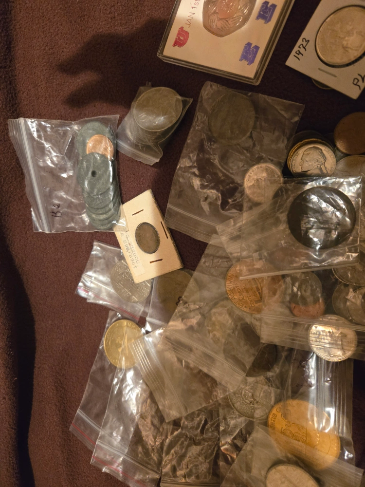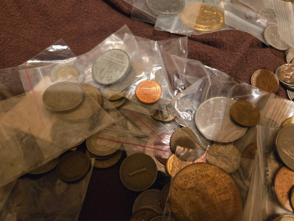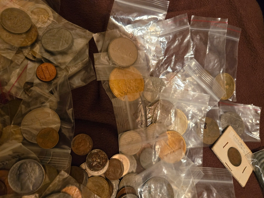 Huge collection of coins in various bags. Many different countries and denominations. Some coins appear older. Great for collectors or hobbyists.