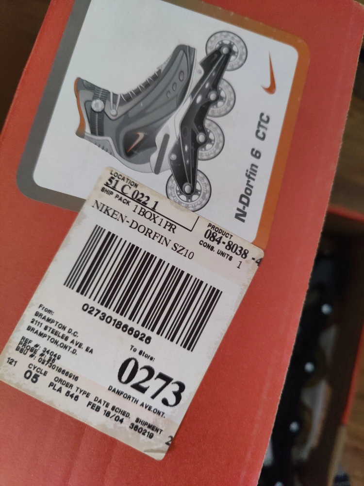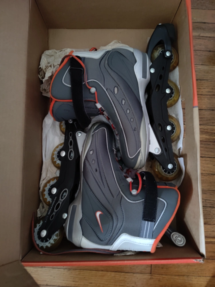 Pair of grey and orange Nike inline skates. Size 10. In original box. new condition. receipt included. purchased for $117 but over 10 years ago