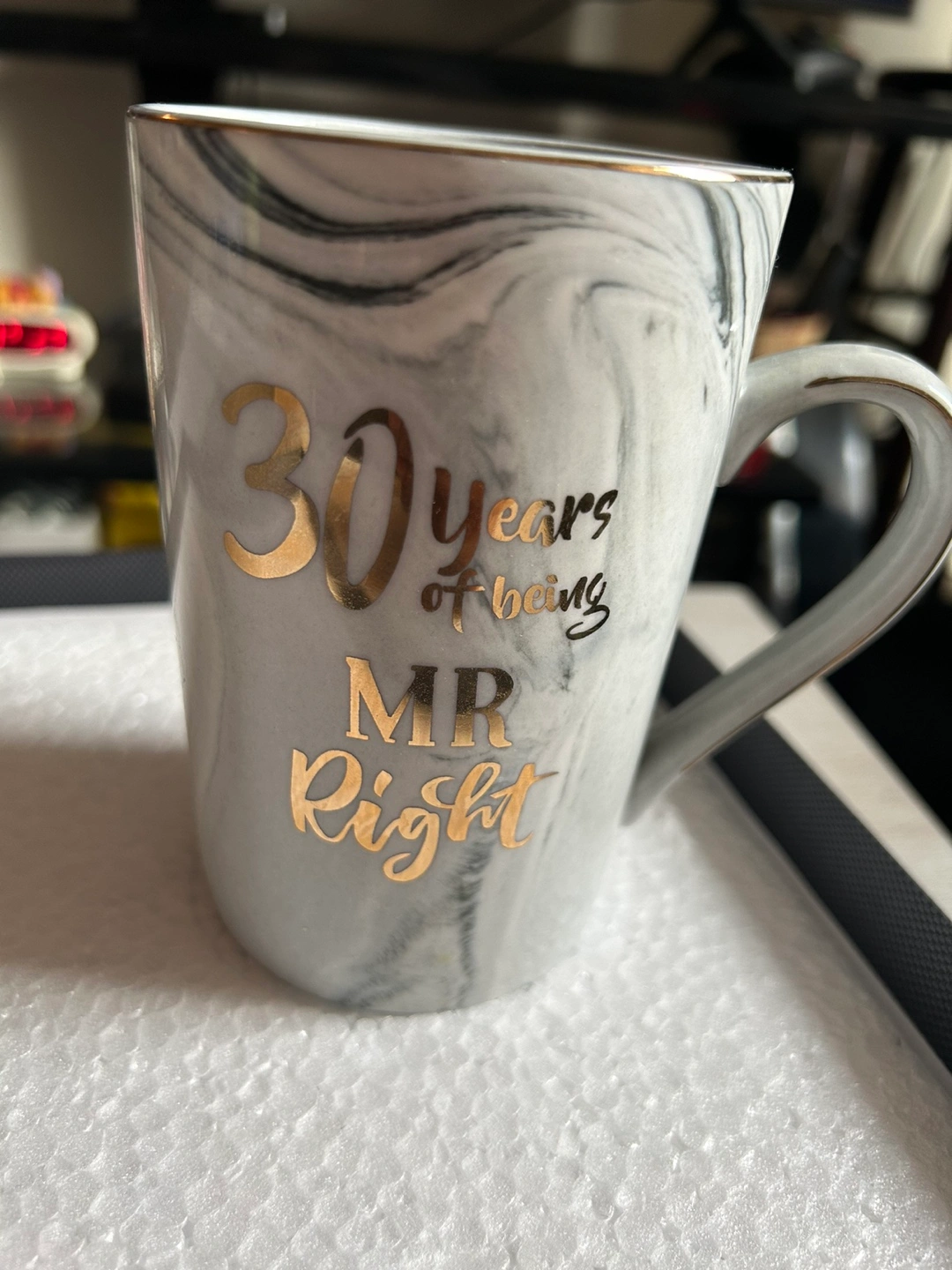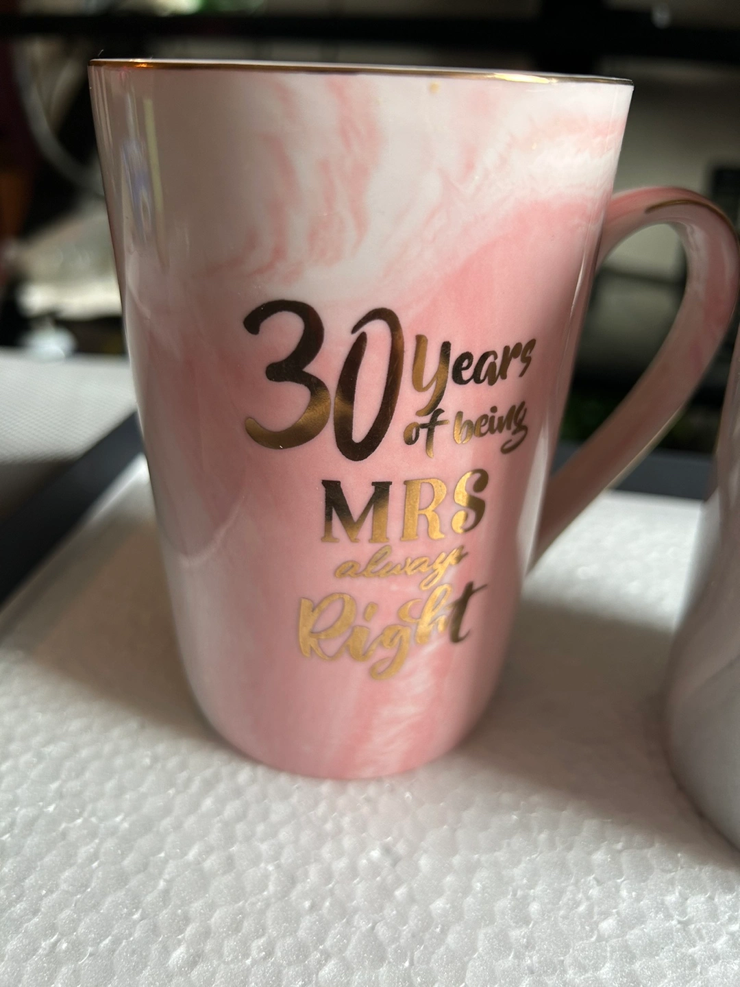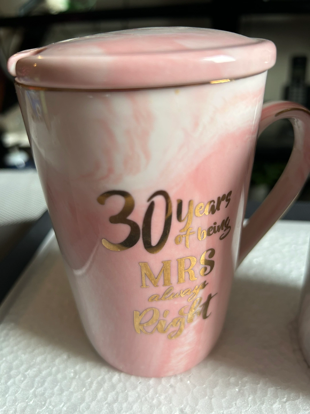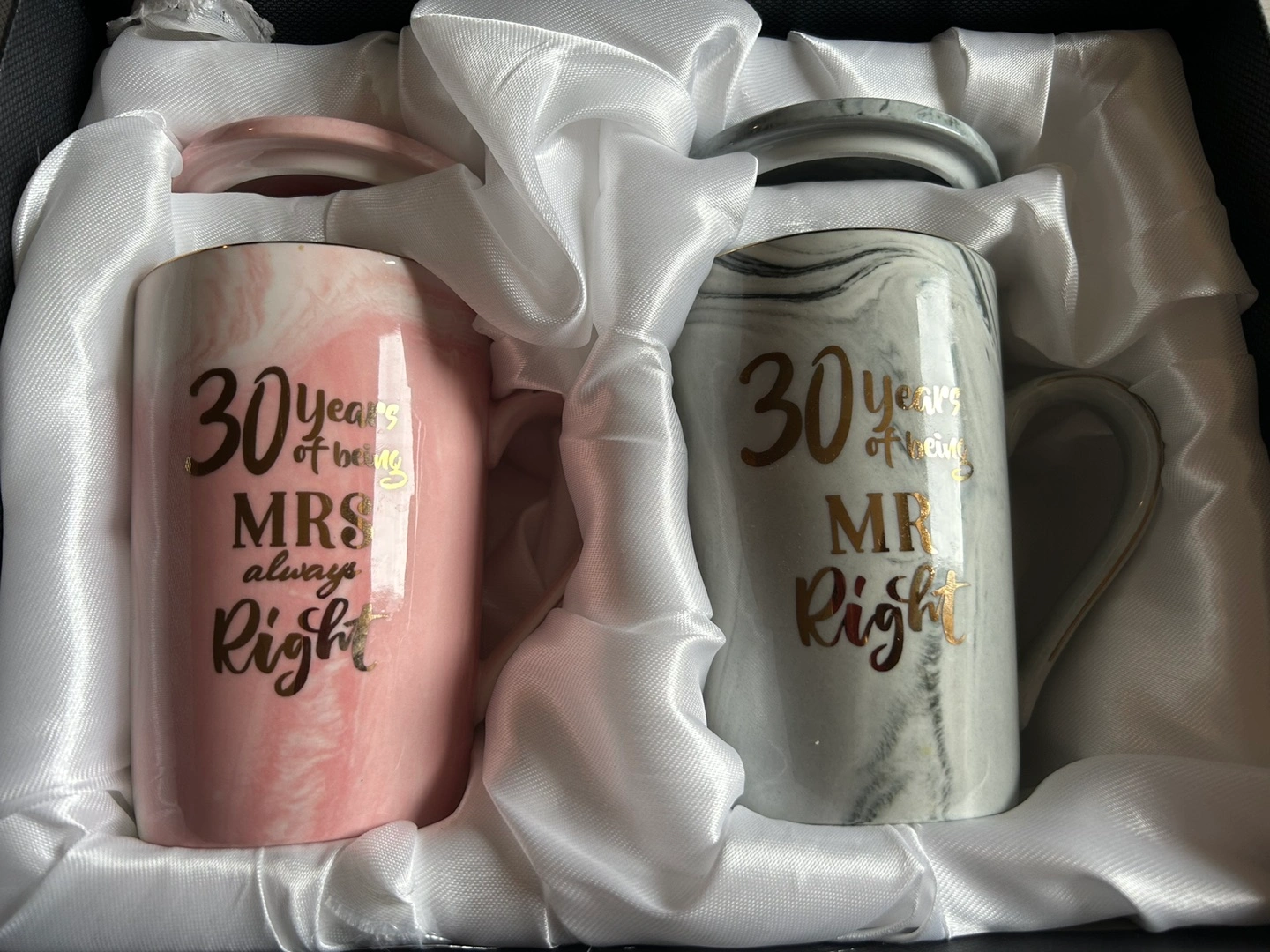 Two 30th Anniversary Marble Mugs with Lids and packaging.