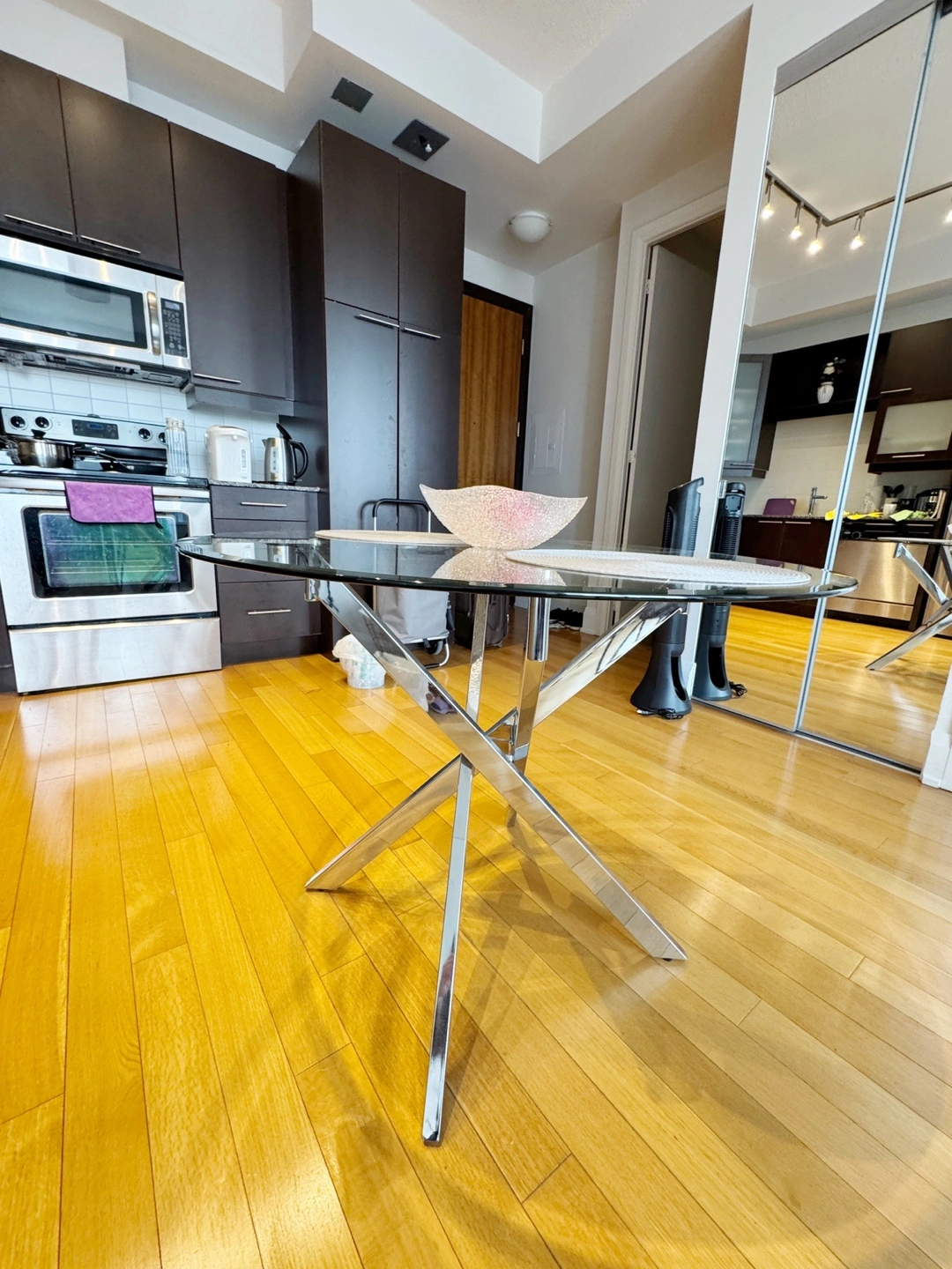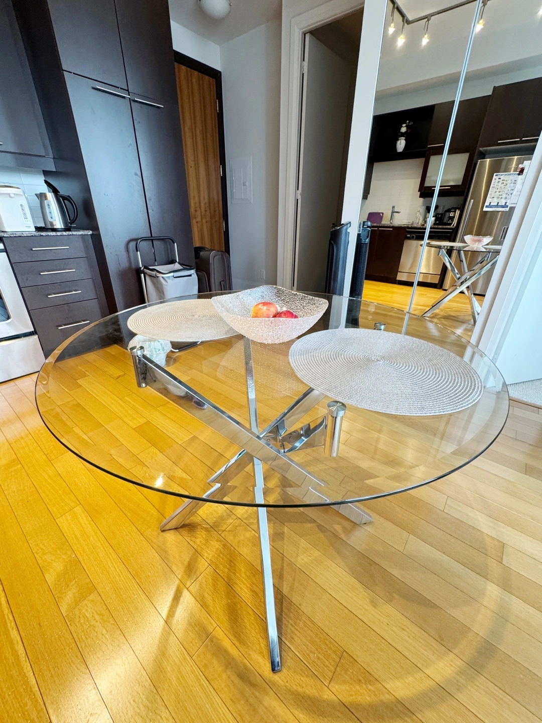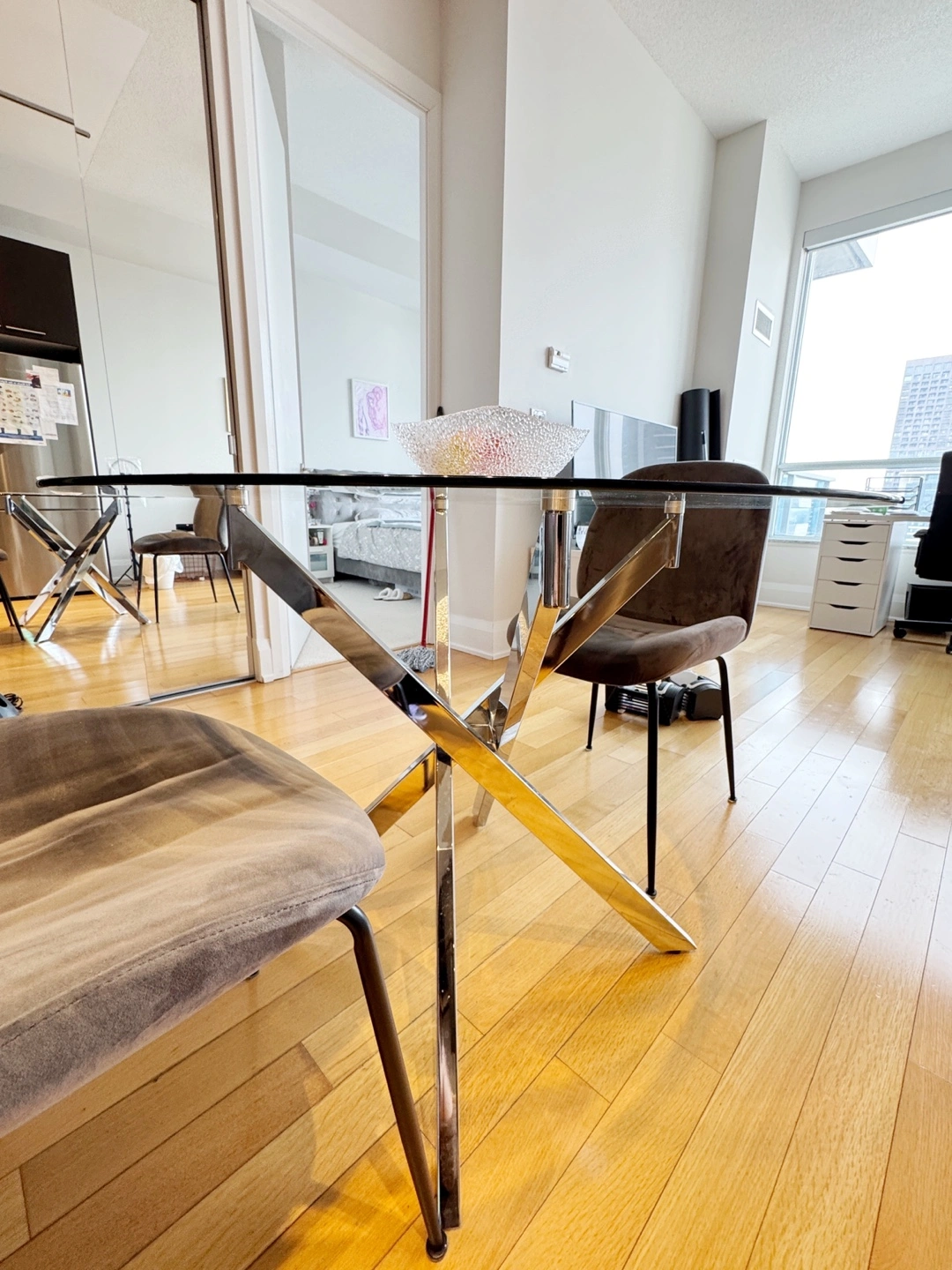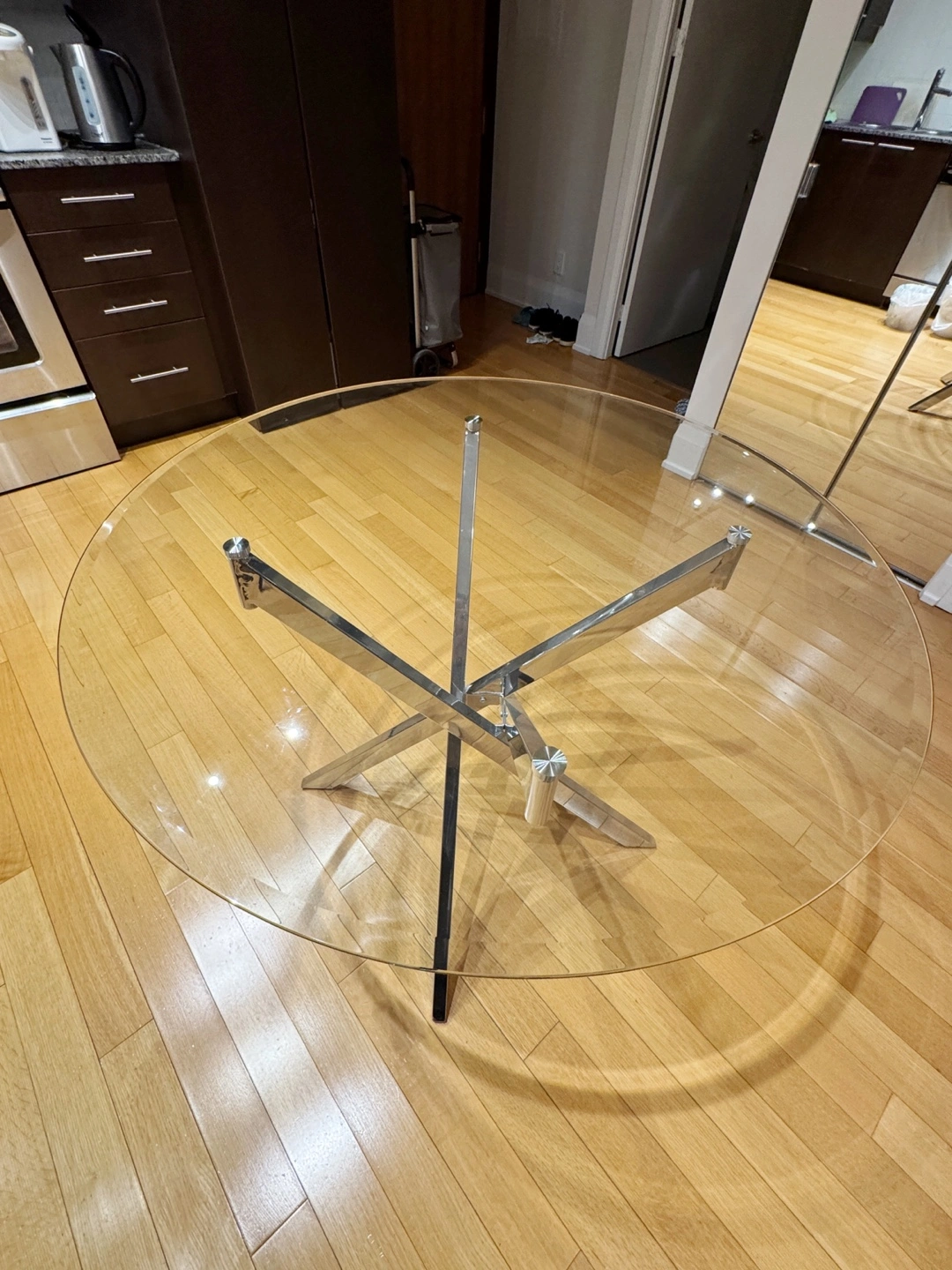 MOVING SALE Modern Round 39” Glass Dining Table w/ Metal Legs 39”W x 30” H In excellent, clean condition No issues or damages Pick-up near Sherbourne and Wellesley See other listings for more items for sale