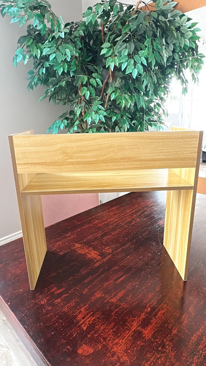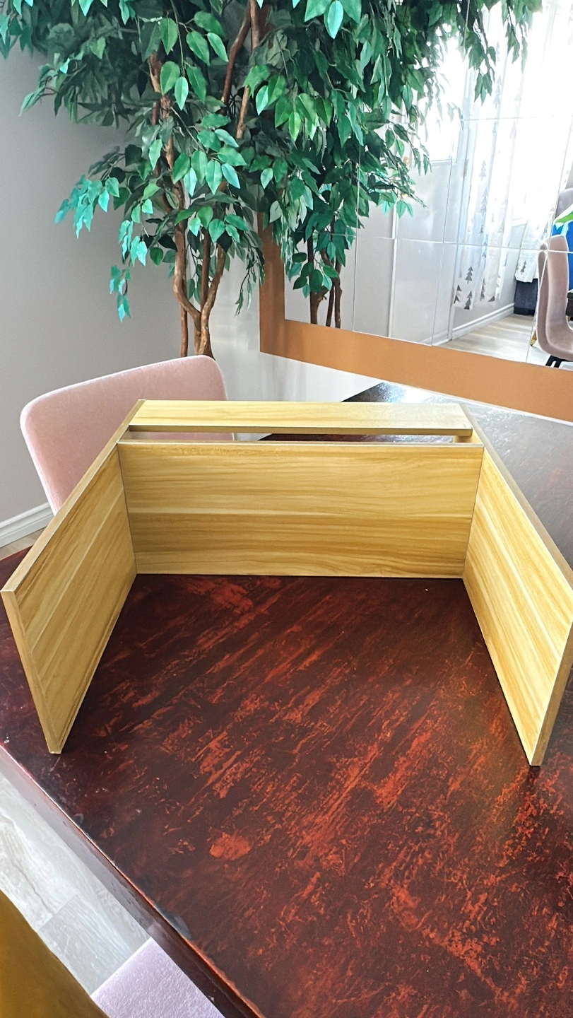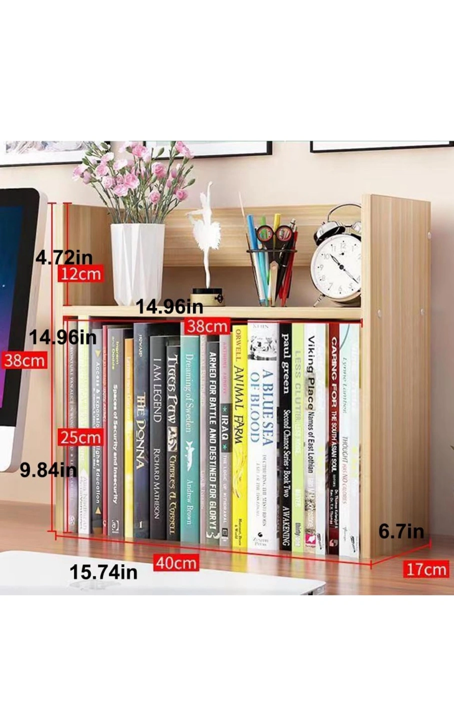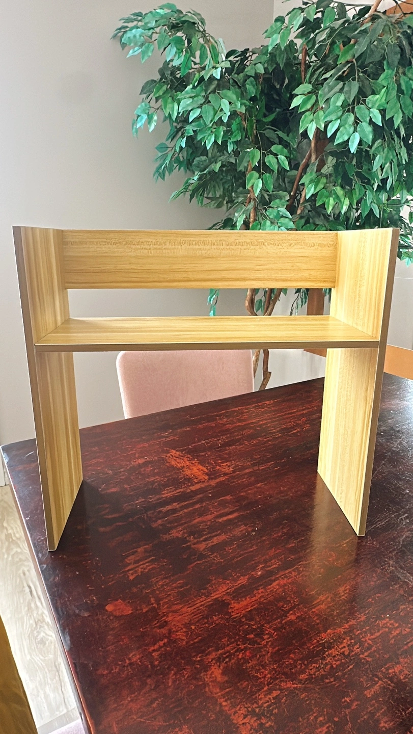 This is a desktop bookshelf organizer in light walnut colour wood. This tabletop mount display shelf is small, but is perfect for displaying your decorations, family photos, books, speakers or plant pots.