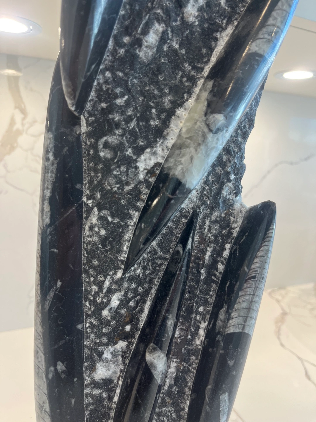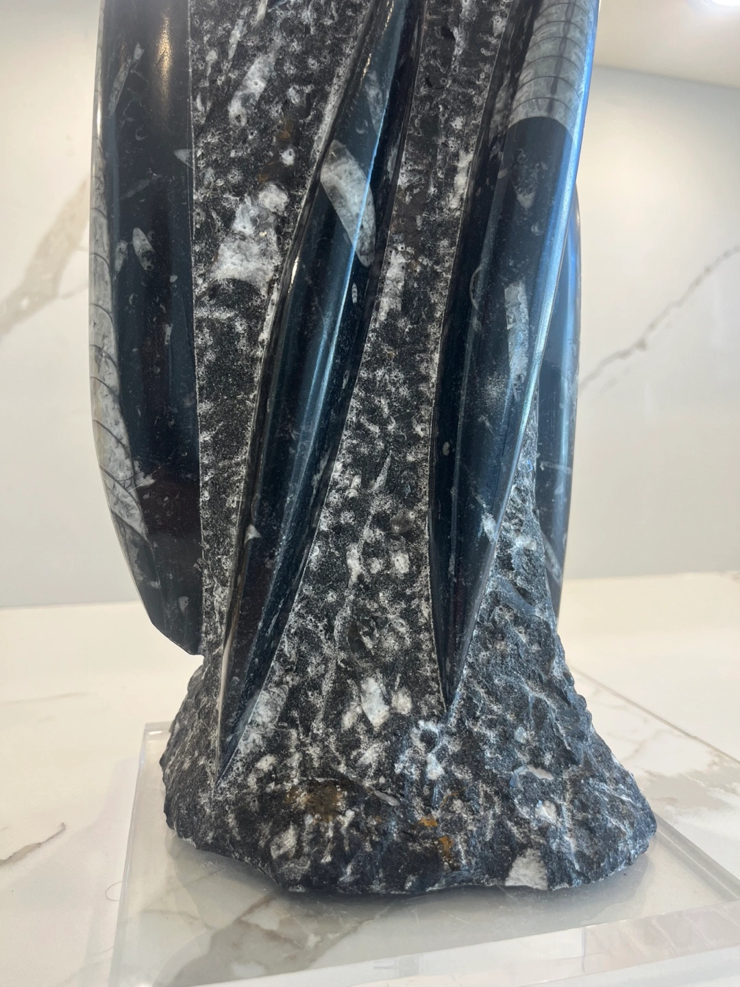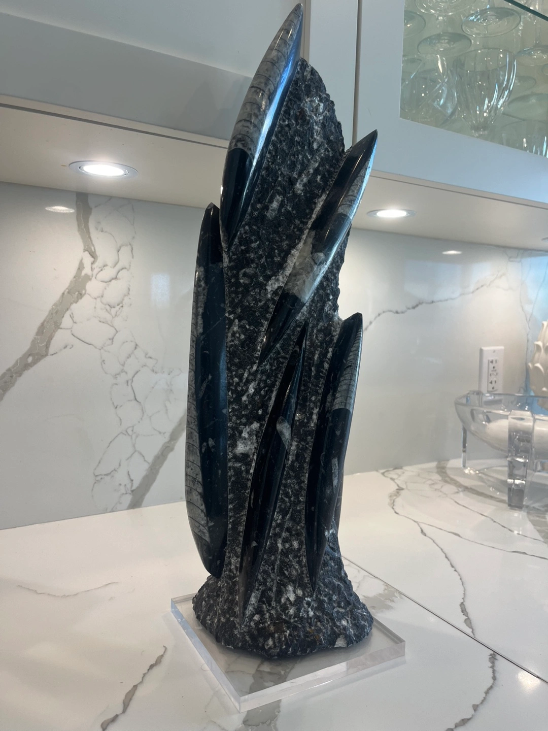 Unique ammonite fossil sculpture. Intricate detail. Black and grey tones. Polished base. Eye-catching centrepiece, 21.5 inches high and 6.5 inches at its widest, the piece is heavy and in great condition, sits on a small clear base.