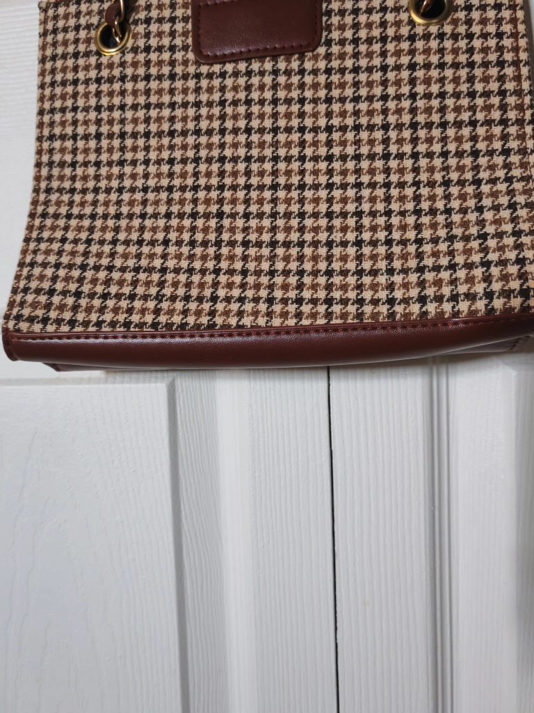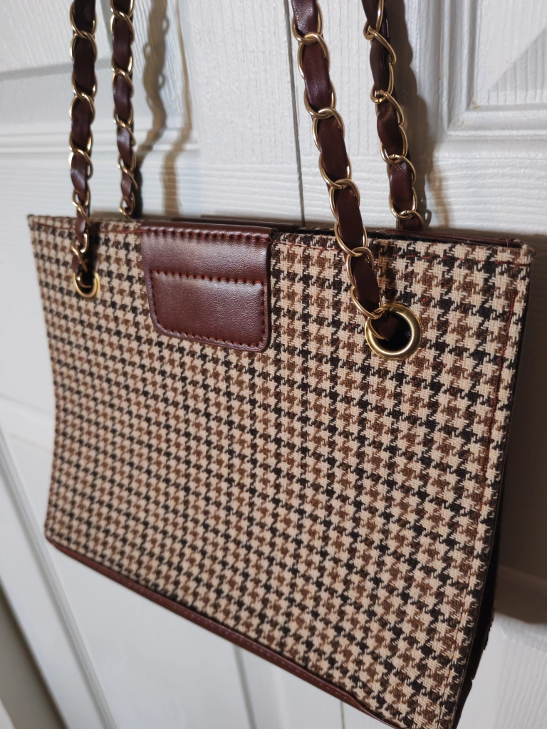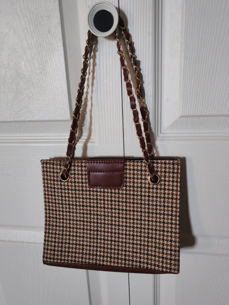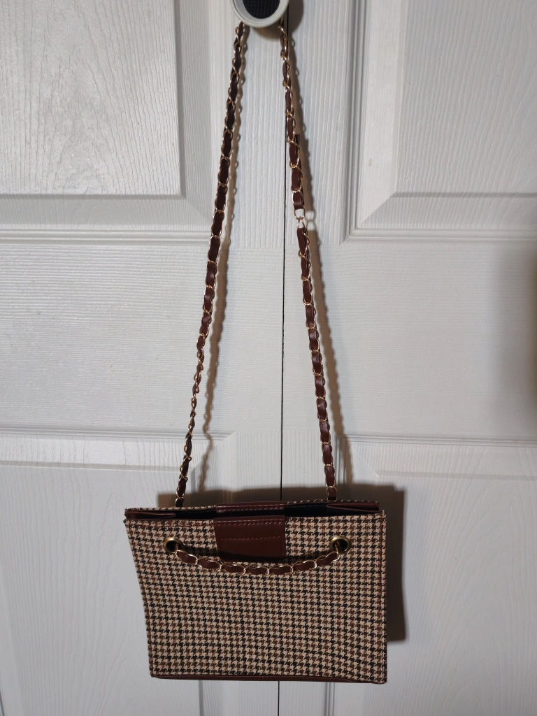 Stylish handbag. Features a houndstooth pattern, brown leather accents, and a gold chain strap. Roomy interior. Perfect for everyday use. It's a small size, can be used as one strap or two straps. Pick up only at Carling Ave (near Britannia Beach) I don't drive. Message me if you have any questions.