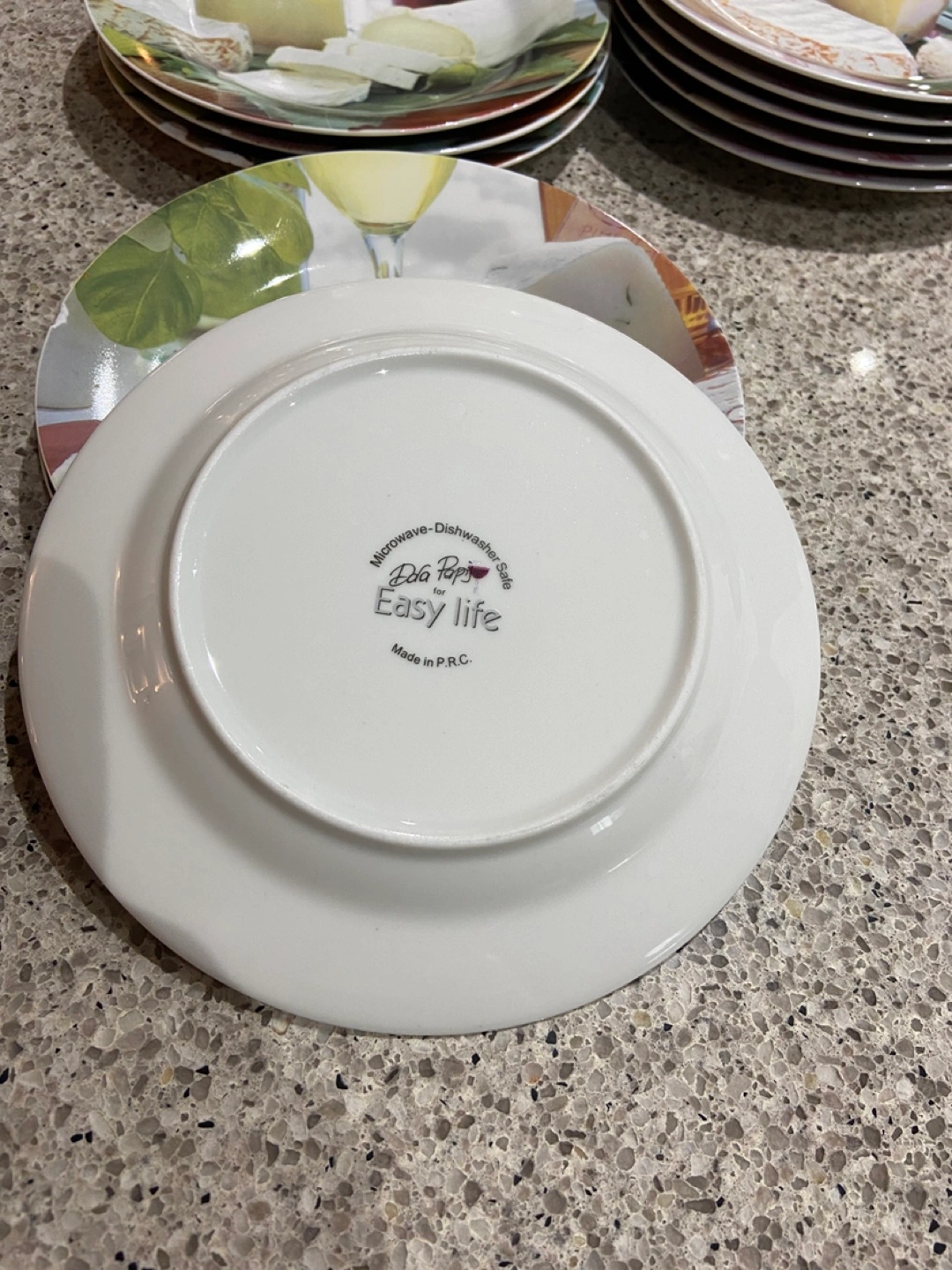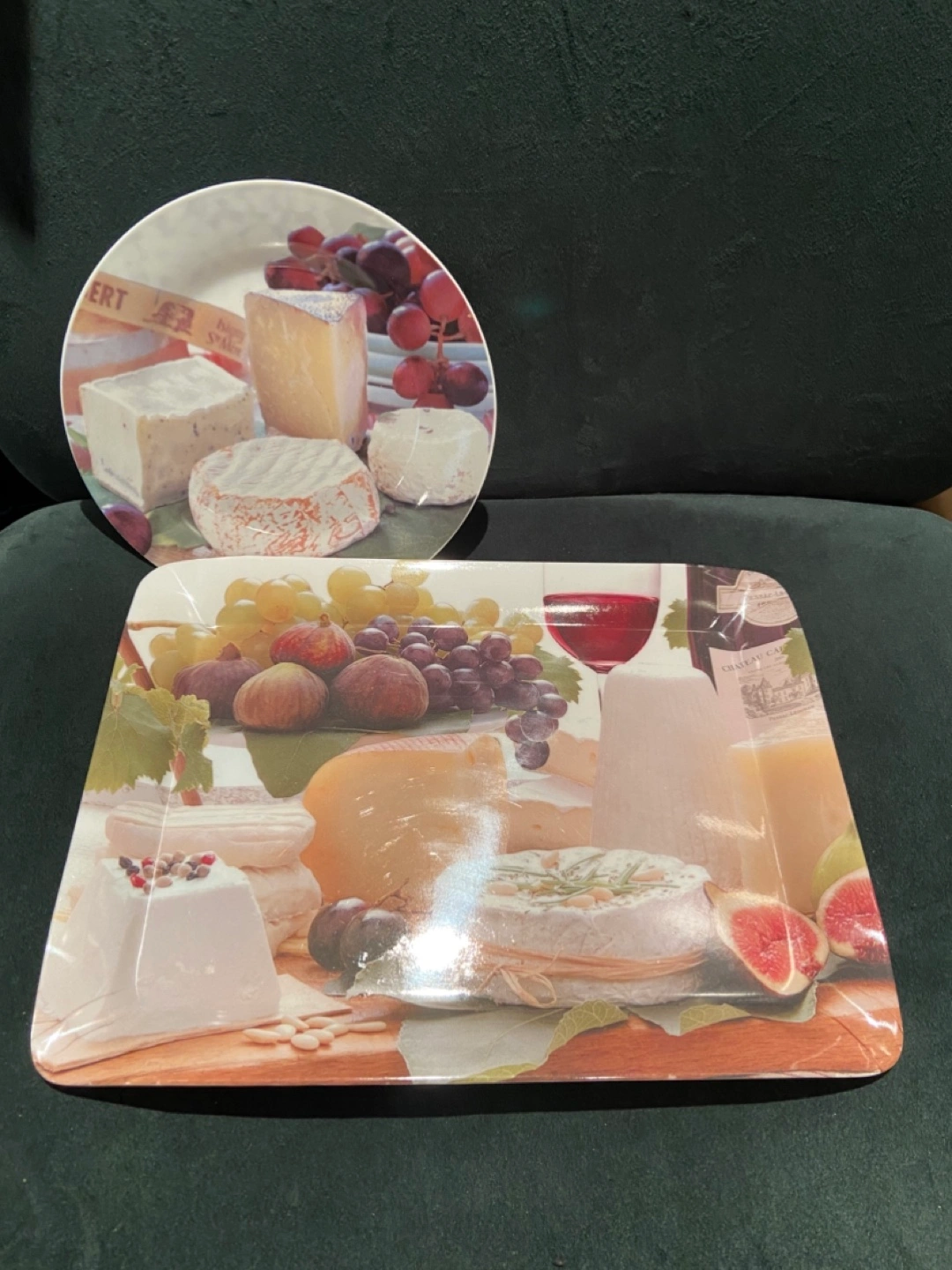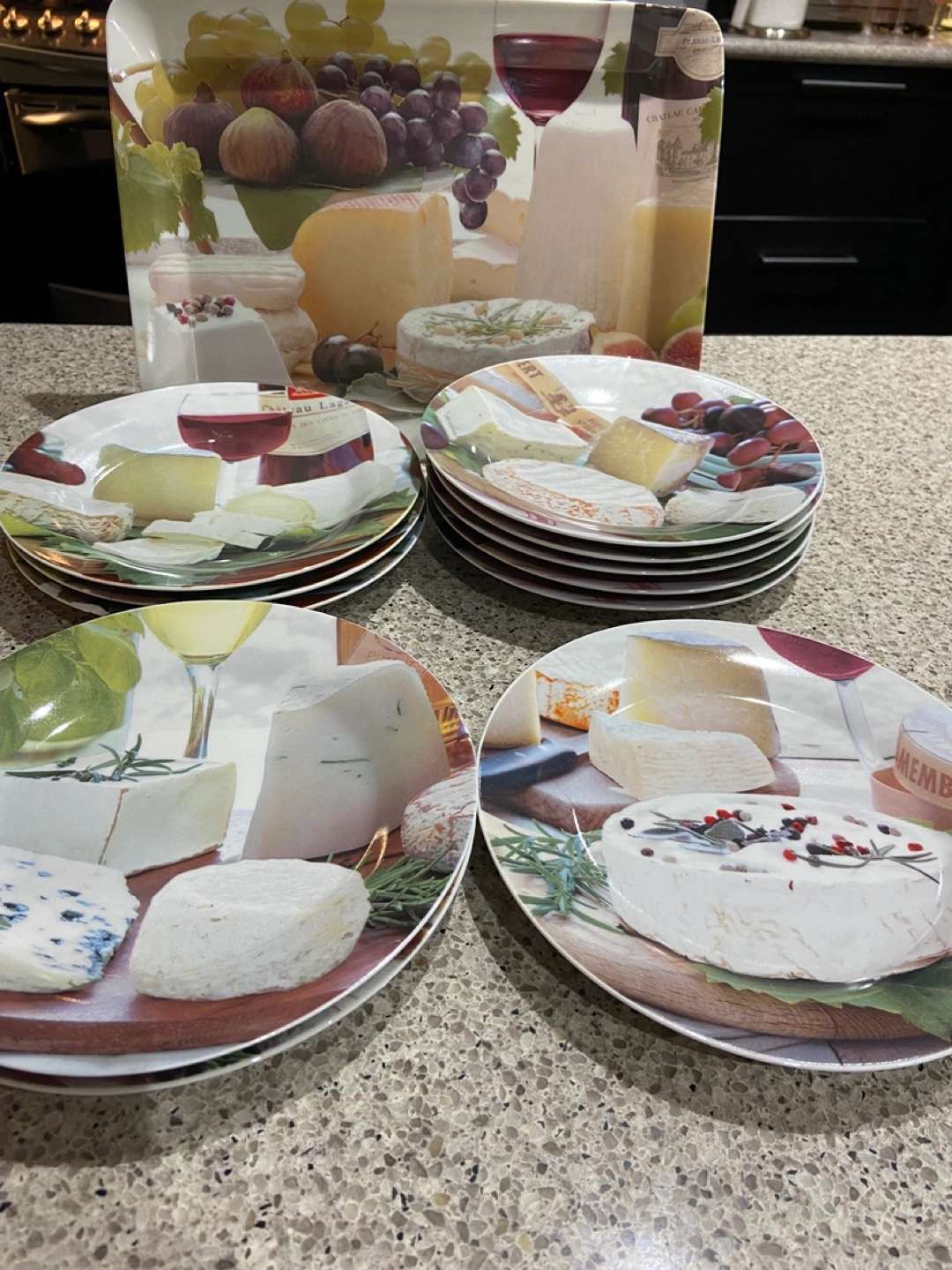 Beautiful cheese-themed set. Includes one large rectangular melamine platter (12 1/4" by 9") and 11 smaller porcelain plates. Perfect for entertaining.
