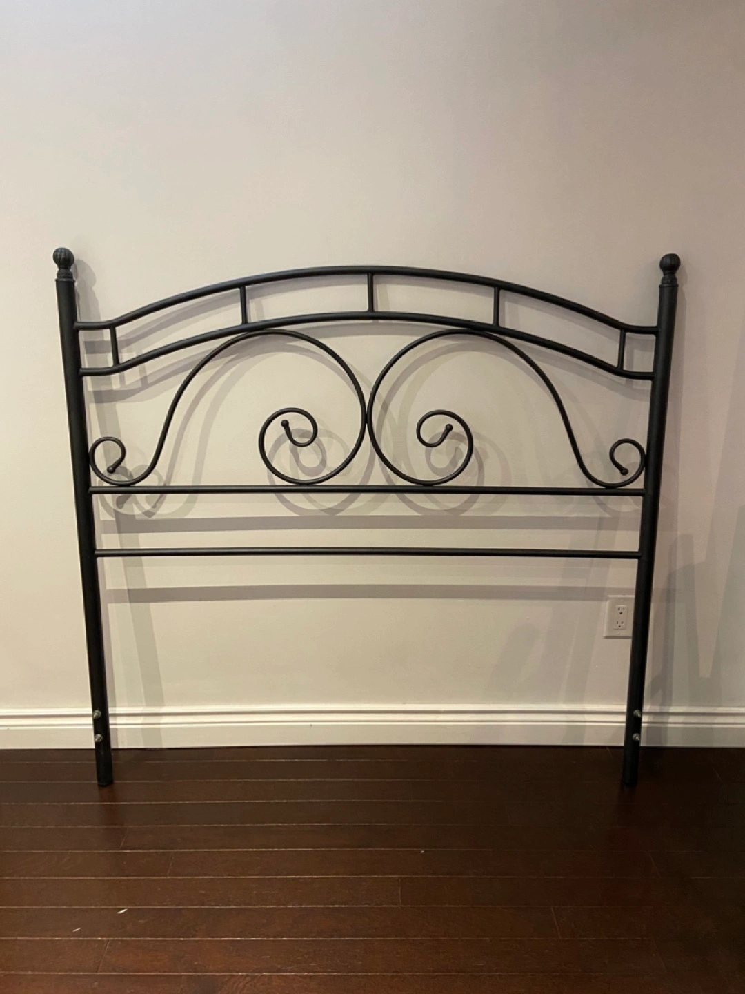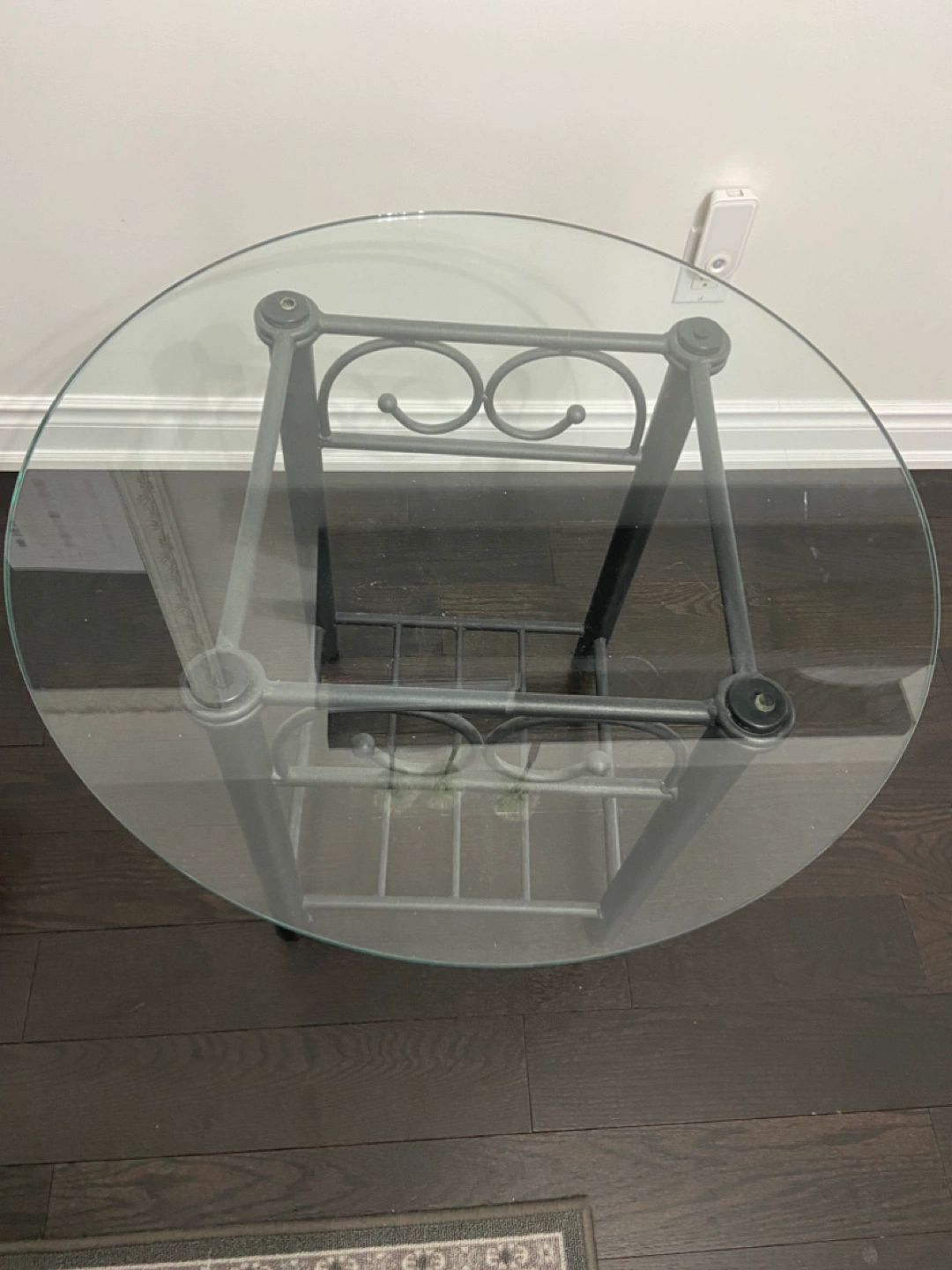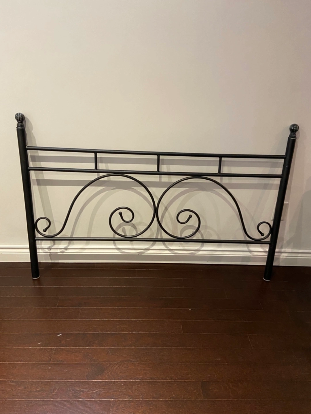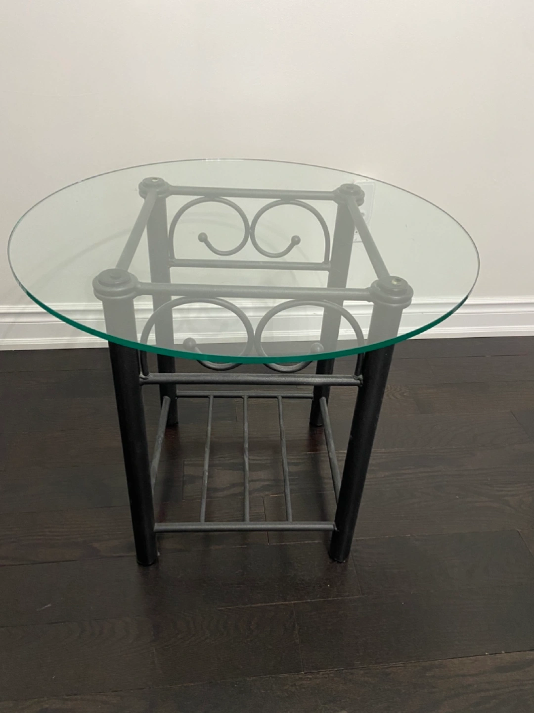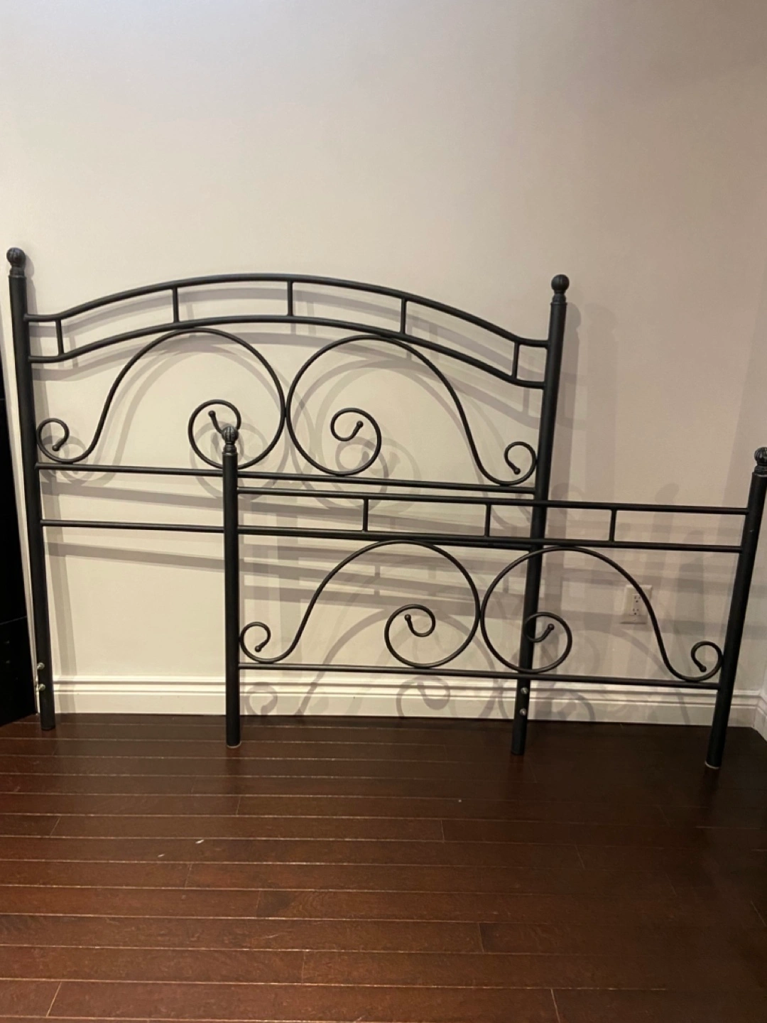 Bedroom set - wrought Iron metal double headboard and footboard with rails and matching side table with round glass top measuring 26" in diameter. Elegant design. Good condition. Asking $170 for all pieces.