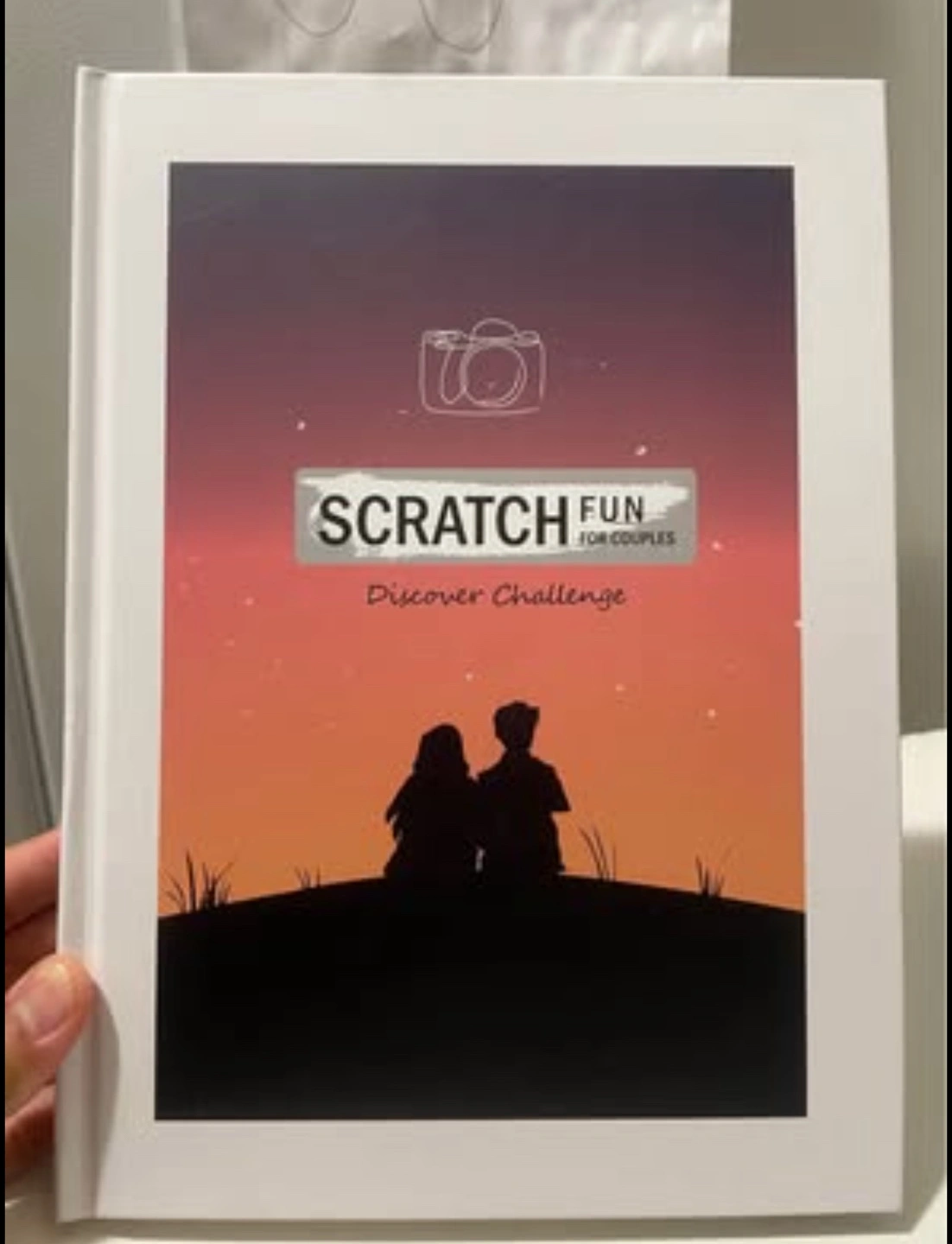 Scratch-off activity book for couples. Features a sunset design and silhouette of a couple. Perfect for a romantic date night.