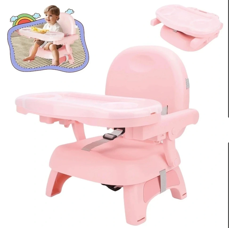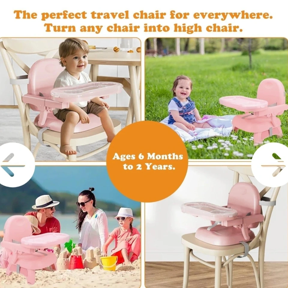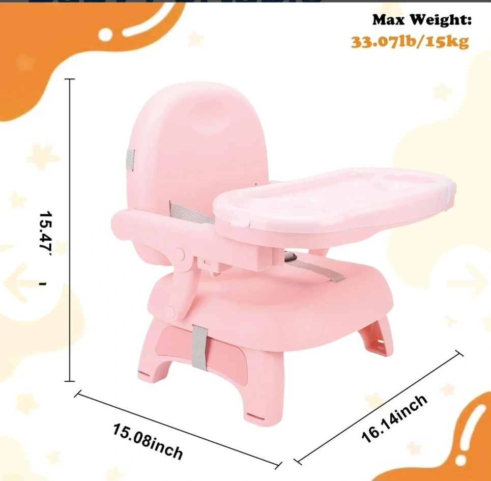 This pink foldable high chair booster seat is perfect for travel and convenient storage. It's designed for ages 6 months to 2 years and supports a max weight of 33.07 lbs (15 kg). The chair weighs only 4.32 lbs (1.96 kg) and folds to a thickness of 5.67 inches, fitting easily into a suitcase. It can also be used to turn any regular chair into a high chair for your little one. The seat dimensions are 15.47" (height), 15.08" (width), and 16.14" (depth).