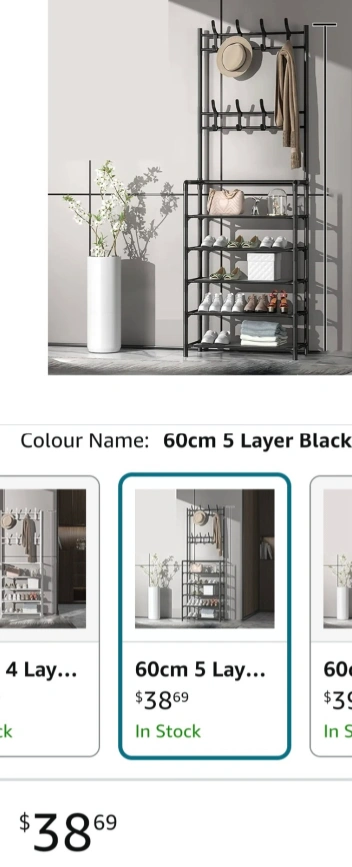 136Space-saving storage solution. Five-tier shoe rack, ample storage. Top features multiple hooks for coats, bags, and accessories. Sturdy metal frame. Easy assembly. *** Color: White, Black *** It's a new product, so it's in a box