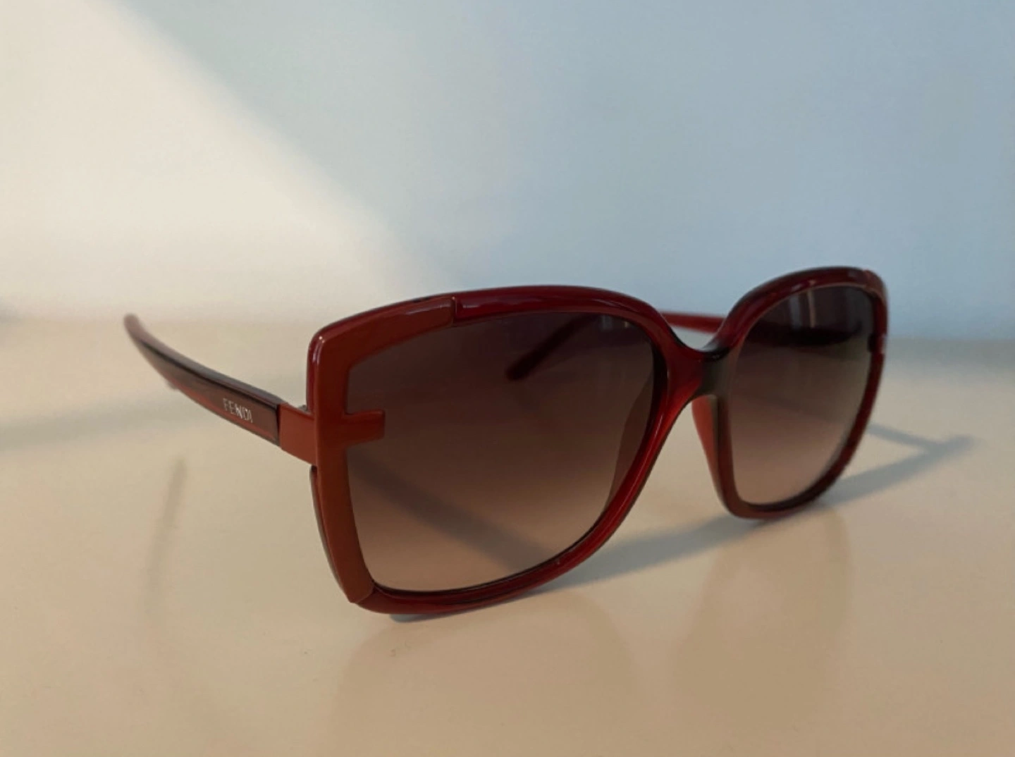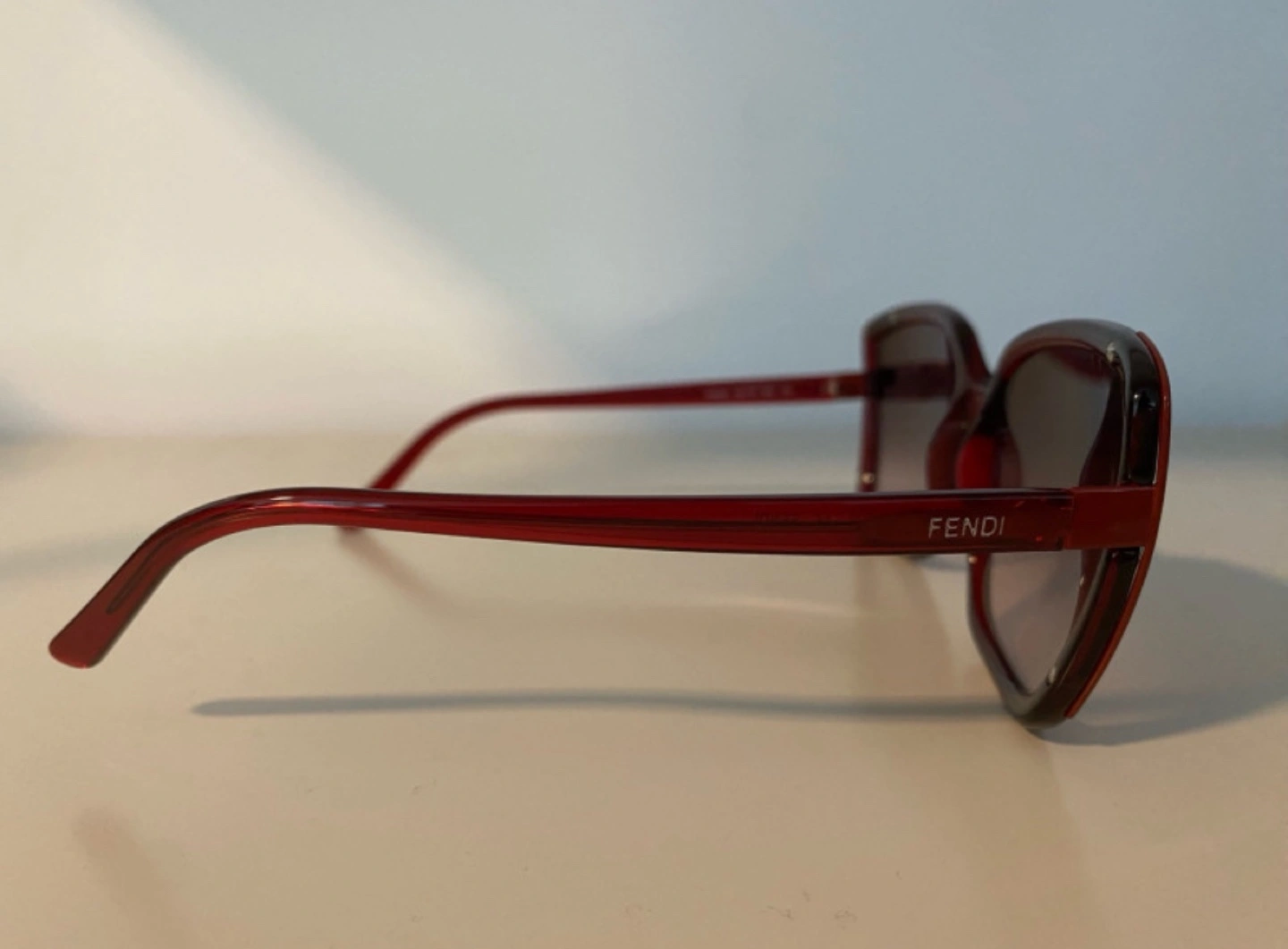 Red square sunglasses. Brown gradient lenses. Fendi branding on arm. Excellent condition.
