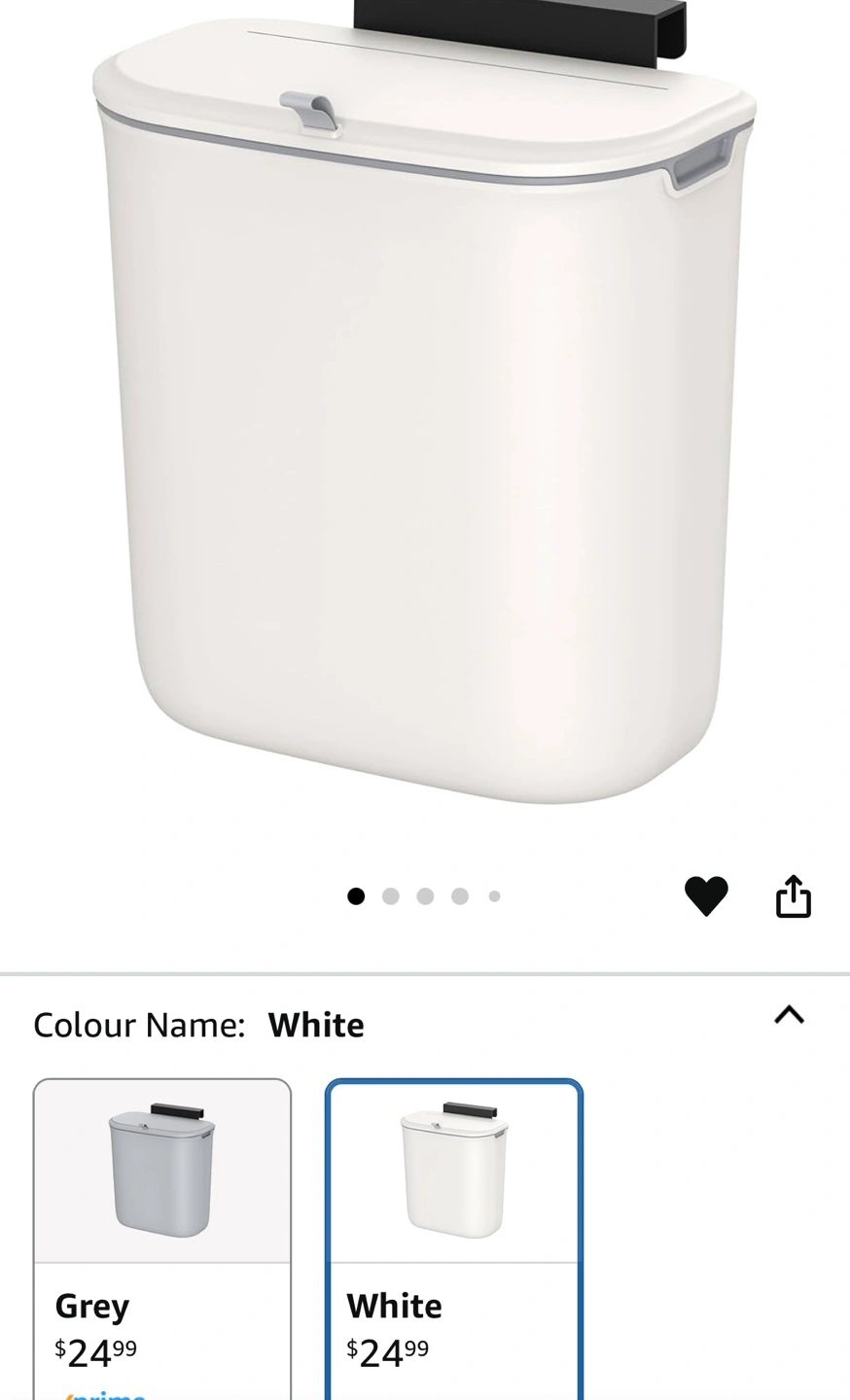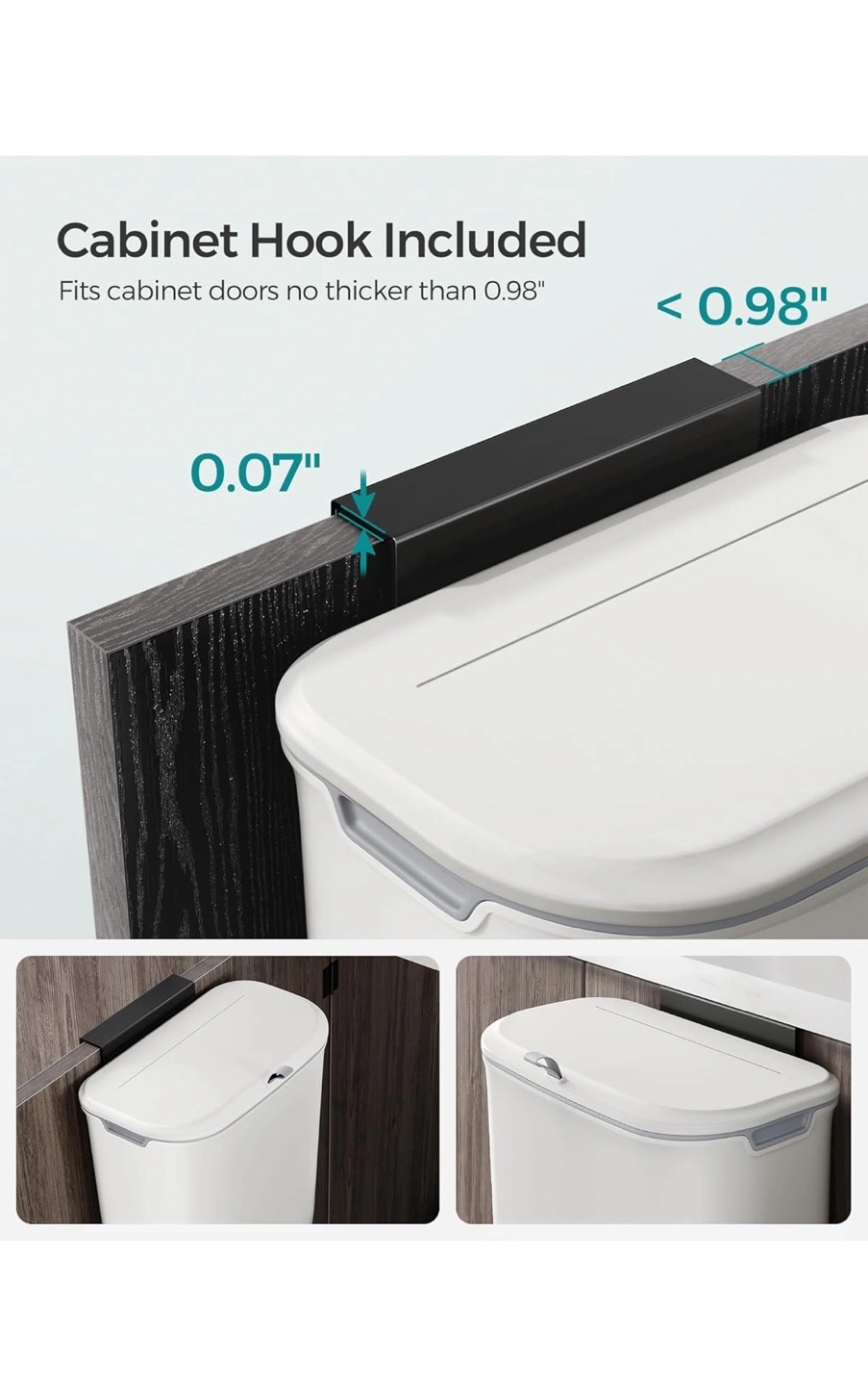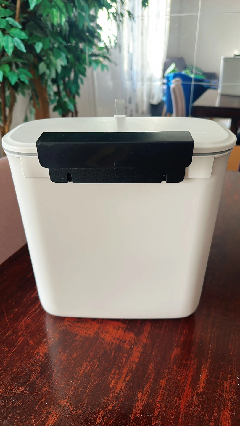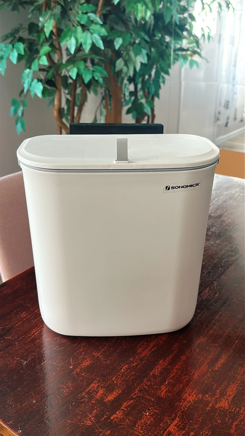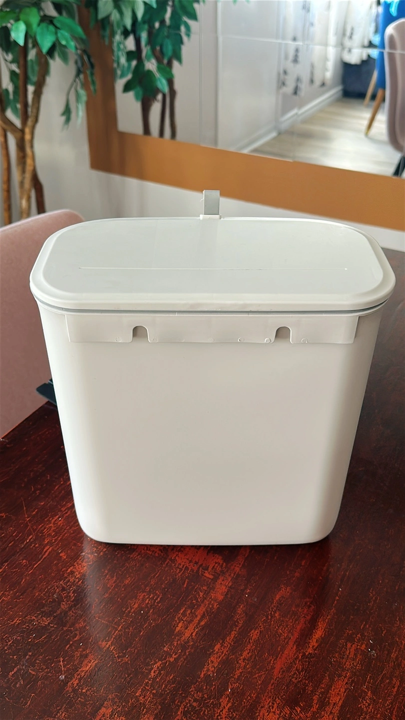 This is a 2.4 gallon hanging kitchen trash bin in clean white colour. It is designed with a tightly sealed lid to prevent odours from escaping.