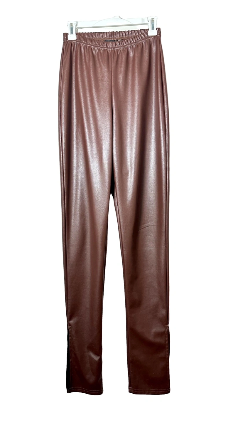 Brown faux leather leggings. Size 10 High-waisted with side slits. Very long for tall girlies. Excellent condition.