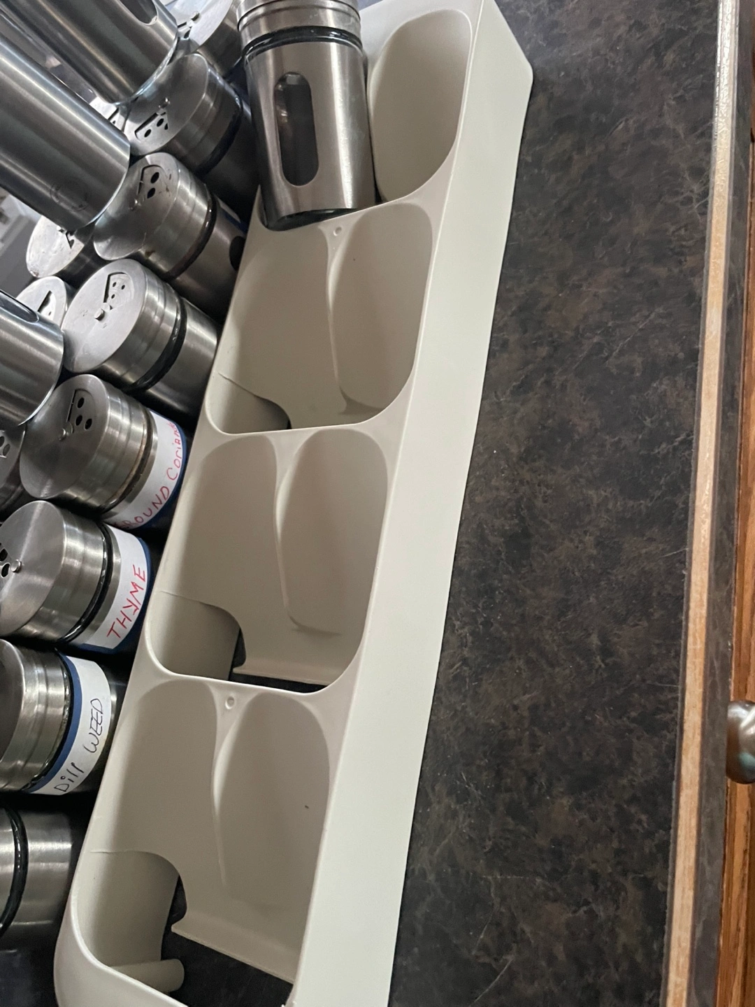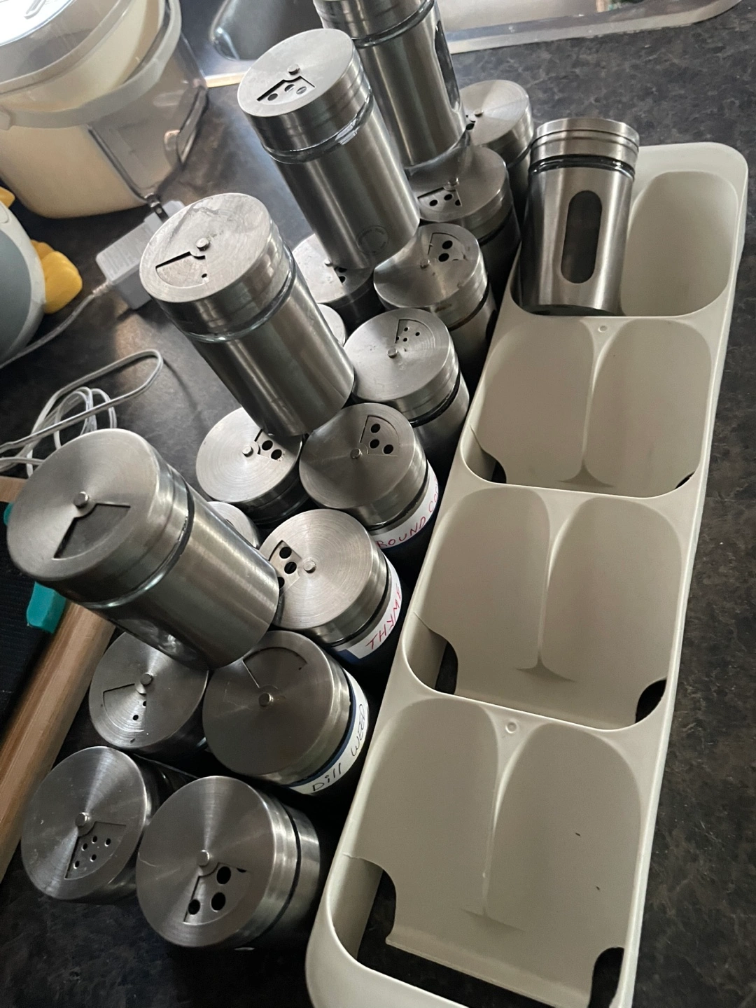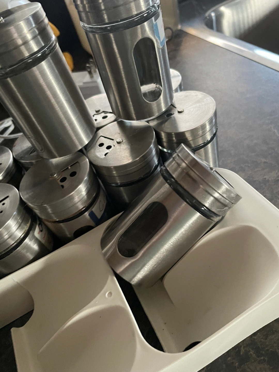 137Set of stainless steel spice jars and a white plastic rack. Great for organizing your spices. There’s 26 jars .