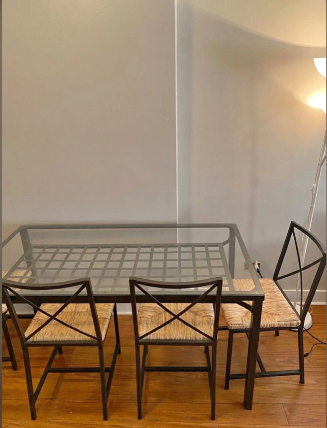 Five-piece dining set. Rectangular glass tabletop. Metal frame. Four chairs with woven seats. Minimalist design. Ideal for small spaces.