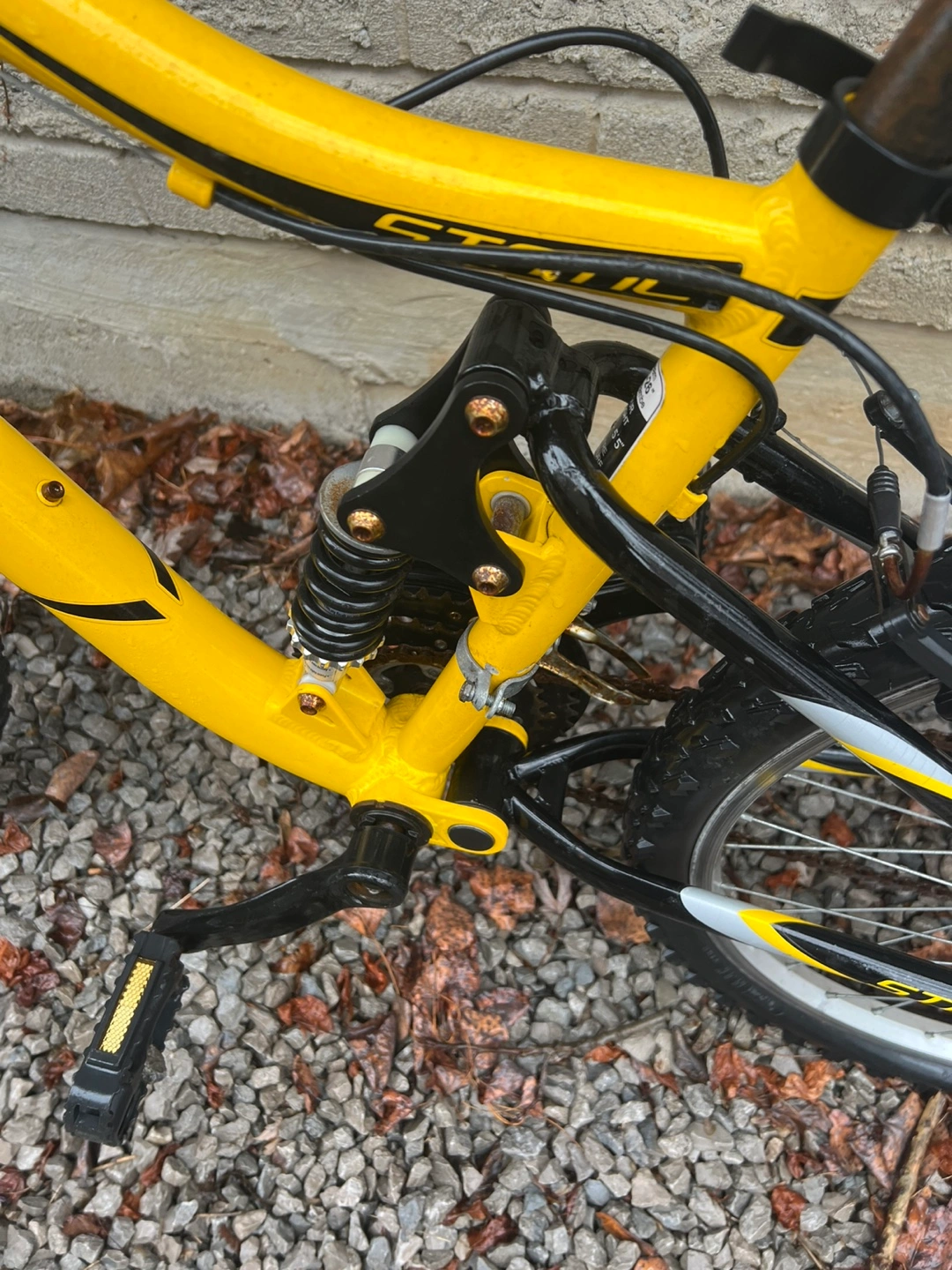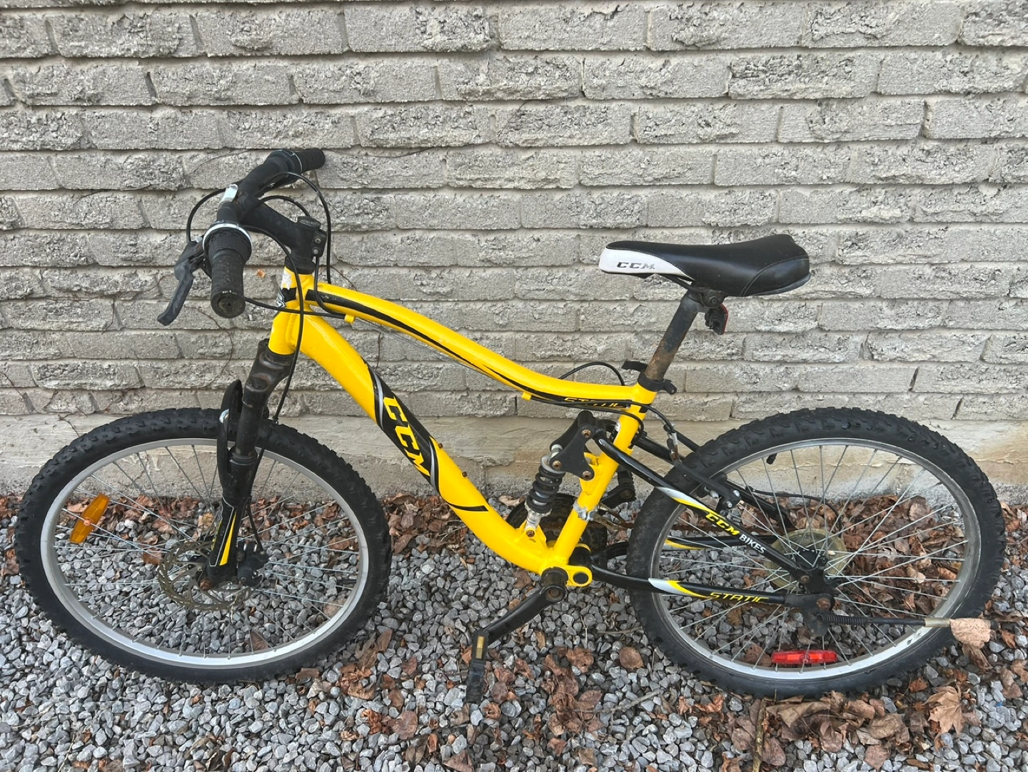 Yellow CCM Static mountain bike. Features front suspension and rear shocks. Good for younger riders. Shows some wear.